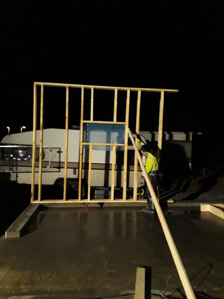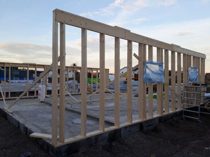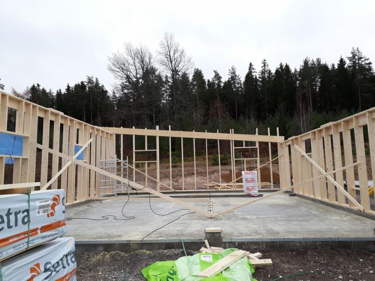 Igår börjades det med garaget, vilket gick mycket snabbare än vad jag hade trott. När jag kom ut till tomten efter jobbet så hade Joakim redan rest en av långväggarna och gjort den andra redo för resning. Idag har vi lagt på den första takstolen och gjort den ena gavelväggen. Det var faktiskt väldigt kul att hålla på att resa väggar, roligare än vad jag hade trott. Idag höll vi bara på fram till lunch då vi skulle på fika med grannar på eftermiddagen, så än så länge har vi kommit längre än vad vi hade planerat med. Det känns som det flyter på bra nu, och man ser verkligen att det går framåt. Men det är nu man börjar inse hur stort garaget kommer att vara, jag har tidigare tyckt att plattan känns liten men nu när väl väggarna börjar komma på plats så har jag helt ändrat uppfattning. Jag undrar hur stort huset kommer att kännas sen…