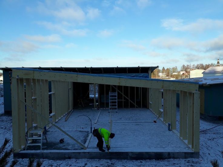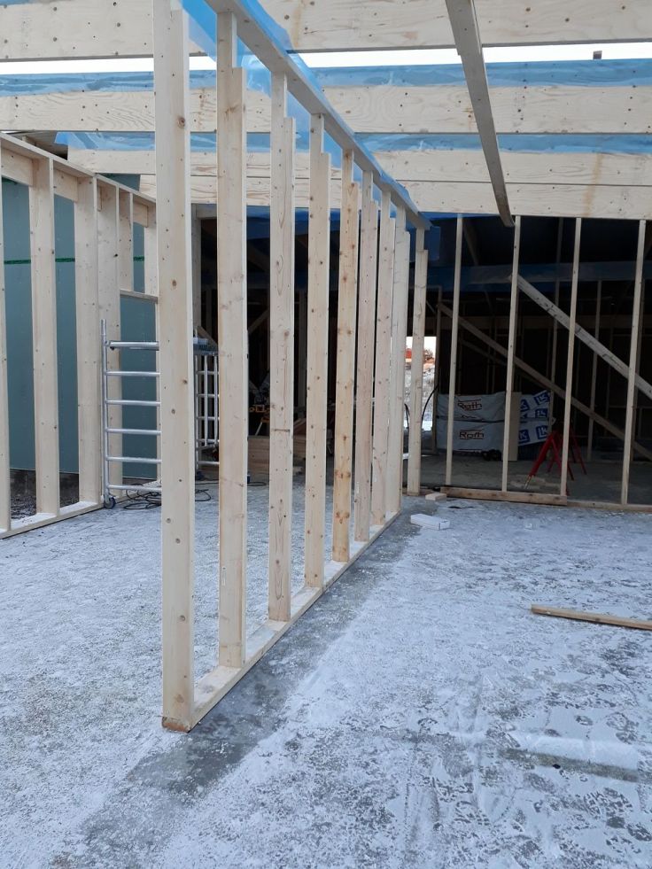 Nu är alla takstolar uppe! Så himla skönt att det är klart, inga mer tunga takstolar att bära. Vi har även fått upp mittväggen i del nummer två. Så nu är det inte så mycket mer vi kan göra innan vi får mer reglar på torsdag. Imorgon kommer jag att skruva färdigt vinklarna till takstolarna medan Joakim tillverkar takfötter och lite annat smått och gott. Vi planerar att börja måla vår panel imorgon. Dock kämpar vädret lite emot oss med minusgrader de närmaste dagarna. Men det går alltid att lösa med en byggfläkt och presenning. Hoppas bara att vädret är på vår sida nästa helg när vi ska lägga det sista taket.