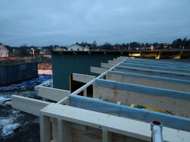 Igår fick Joakim dit gaveln och alla takfötterna. Så idag fick jag börja med att bära in all isolering som vi fått till huset medan Joakim fortsatte att sätta de sista reglarna över våra fönster. Man behöver knappast gå till gymmet efter att ha flyttat på all den isoleringen. Så nu har vi äntligen lite plats på framsidan av huset igen. Vindduken har även kommit upp och en liten special vägg är byggd där de två taken kommer att mötas. Så nu är vi redo för takläggning imorgon. Eftermiddagen gick åt att måla vår panel och nu har vi målat all panel som var i garaget. Men det går ingen nöd på oss för det finns två paket till framför garaget som ska bäras in och målas. Men vi tror att vi har målat cirka 1/3 nu, så det går framåt. Än så länge följer vi helgens planering.