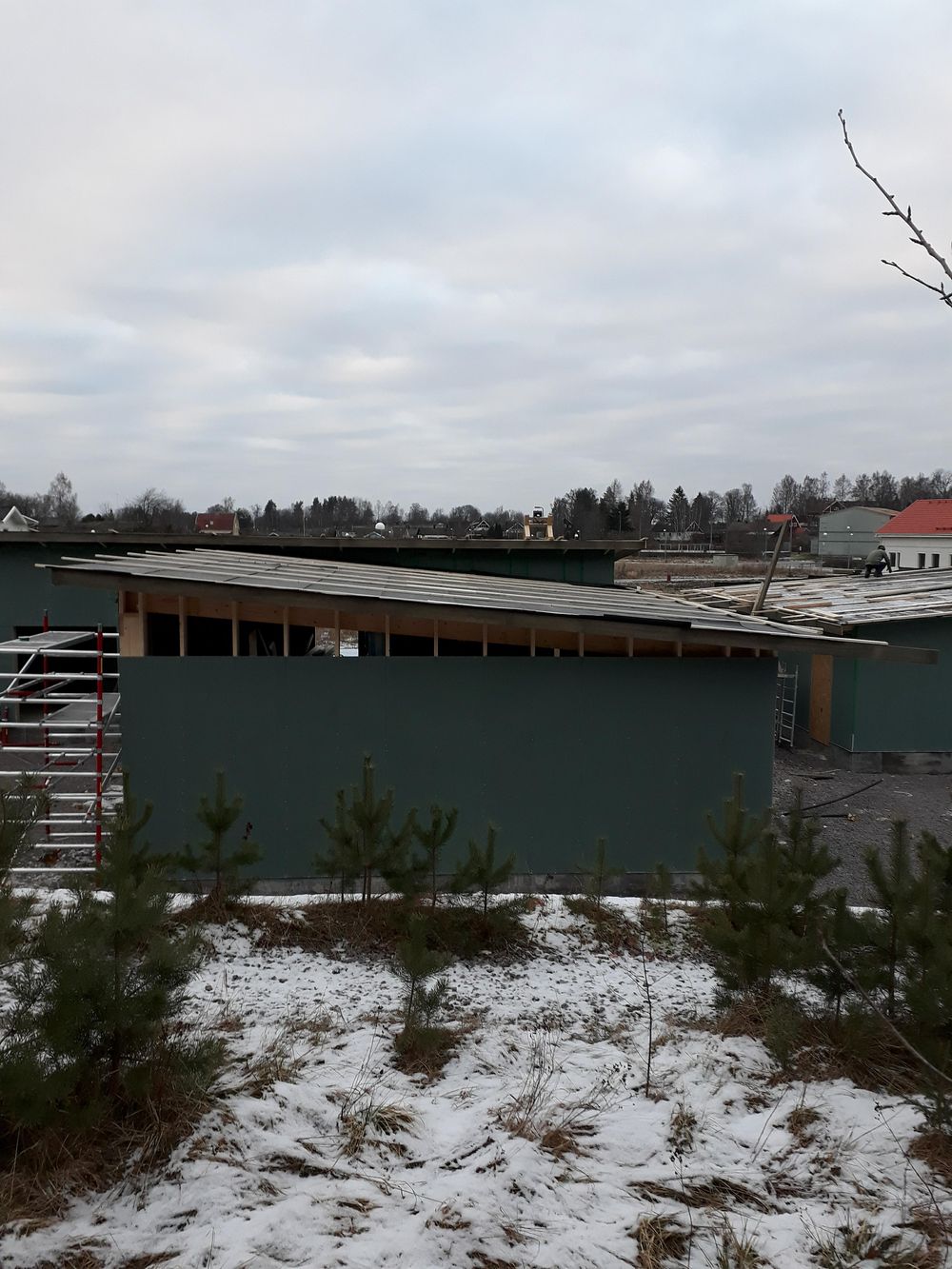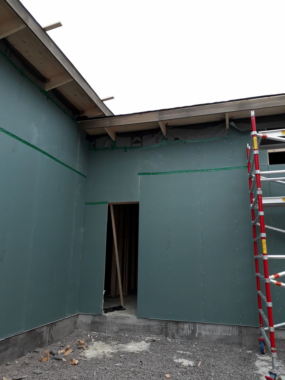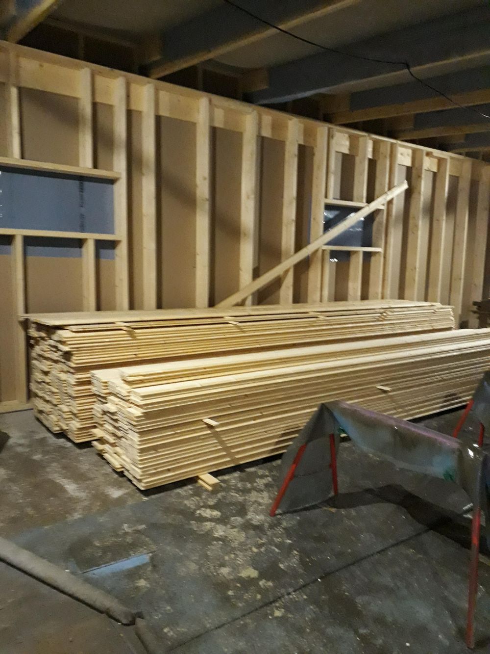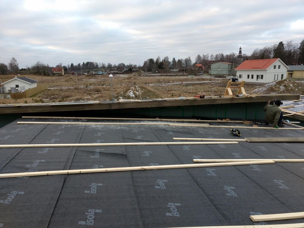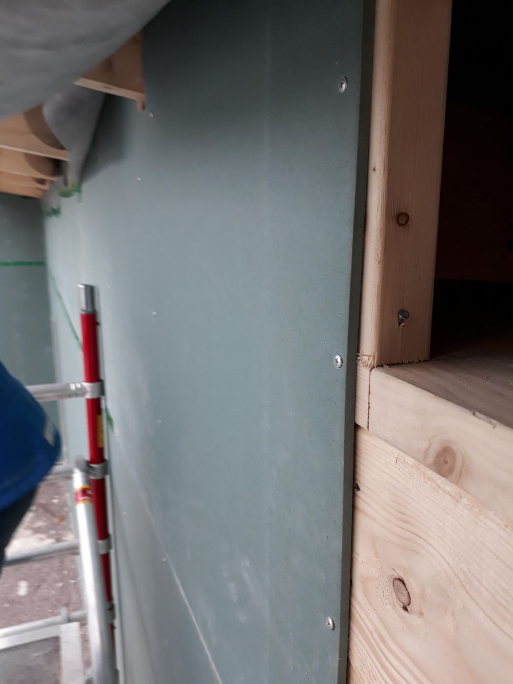 Vilken dag och helg det har varit! Vi har jobbat på som bara den hela helgen och mycket har vi fått gjort. Idag har vi varit väldigt tidseffektiva. På vägen till bygget kom vi på att det är bättre att jag och mamma börjar med att bära in all panel som är kvar att måla in till garaget, så att det är redo för målning. Det är mycket smidigare att bära på två jämfört med när jag bar själv, så det var riktigt skönt att det blev gjort. Joakim och pappa började med att gipsa den lilla kilen som blir mellan de två taken eftersom de är olika höga. Som de kämpade med denna gips men resultat blev riktigt bra! Efter det gick de vidare på nästa steg med att sätta fotbrädor och vindskivor. Så de har krupit runt på de tre olika taken hela dagen. Men nu är alla vindskivor uppe på huset och garaget förutom en, eftersom vi hade en bräda för lite. Efter att jag och mamma burit klart all panel så gick vi vidare till att börja gipsa de översta småbitarna. Eftersom de ska sitta högst upp mot taket så var det att arbeta med ställning som gällde. Vilket innebar mycket klättring upp och ner. Det tar mycket längre tid att sätta de små bitarna än de stora eftersom det är mycket mer mätning och sågning. Vi fick dit alla gipsskivor på den högsta sidan idag sen var mina föräldrar tvugna att åka hem. Vi åkte hem kort därefter då vi också kan behöva ha lite ledigt. Ikväll blir det att ta det lugnt, laga lite mat och massage. Det är välbehövligt efter helgens tunga arbete.