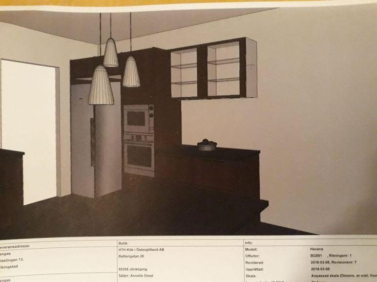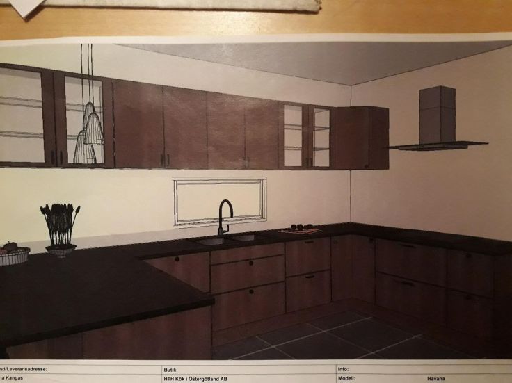 Som rubriken lyder, nu har vi äntligen beställt vårt kök. Det blev ett kök från HTH, från deras ”Gör det själv” sortiment. Eller det blev en blandning mellan det och deras dyrare sortiment. ”Gör det själv” innebär att köket kommer i platta paket så att vi får montera ihop det själva. Det bemötandet vi har fått på HTH är verkligen super, och vår köksdesigner har verkligen varit hjälpsam och lätt att samarbeta med. De får verkligen toppbetyg av oss. Vi är verkligen nöjda med hur köket är utformat och det borde vi vara med tanke på hur mycket tid vi har lagt ner på att rita och planera köket. Idag tog besöket närmare två timmar, men det var det värt med tanke på hur bra resultatet blev. Köket kommer vecka 15, och innan dess har vi en del som ska göras. Men det är skönt att vi har en deadline att arbeta emot, så nu får vi ligga i lite för att bli klara. Visst, det gör inget om köket får ligga ett tag innan det blir monterat men det känns skönt att hinna få det andra klart innan så att det bara är att börja med köket direkt. Dessutom så kommer inte paketen att vara i vägen när vi gör andra delar. Nedan finns det två bilder på köket, vi har ändrat lite i köket t.ex. hur vitrinluckorna ser ut men det mesta stämmer. Jag ber om ursäkt för lite dåliga bilder så papret är ganska glansigt. Men det ger iallafall ett helhetsintryck på hur vårt kök kommer att se ut.