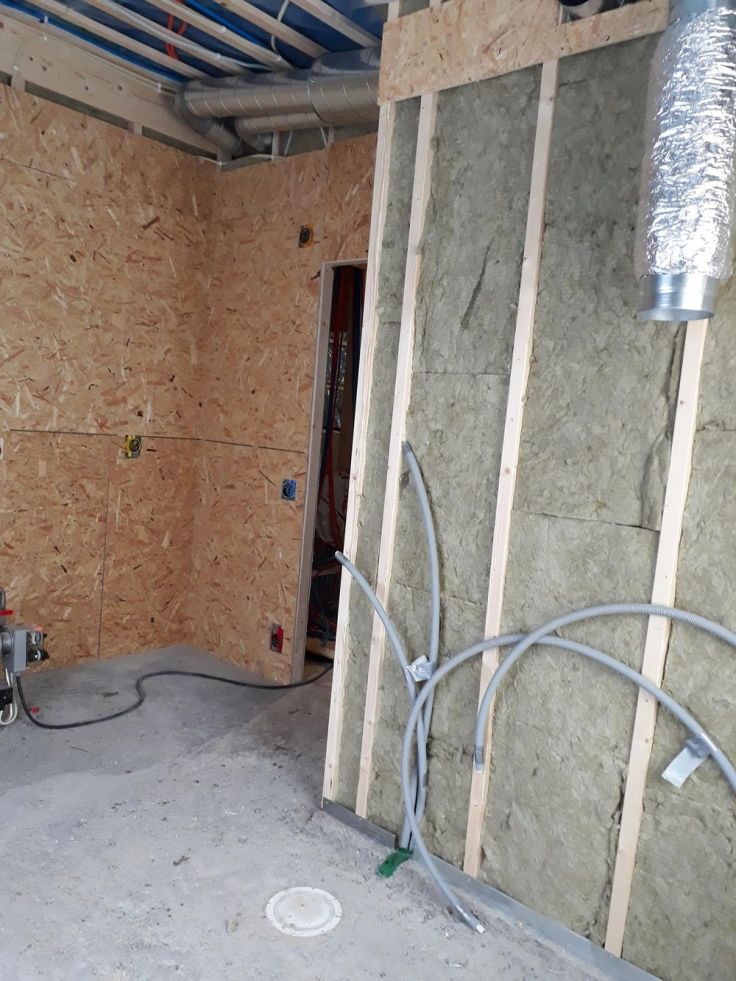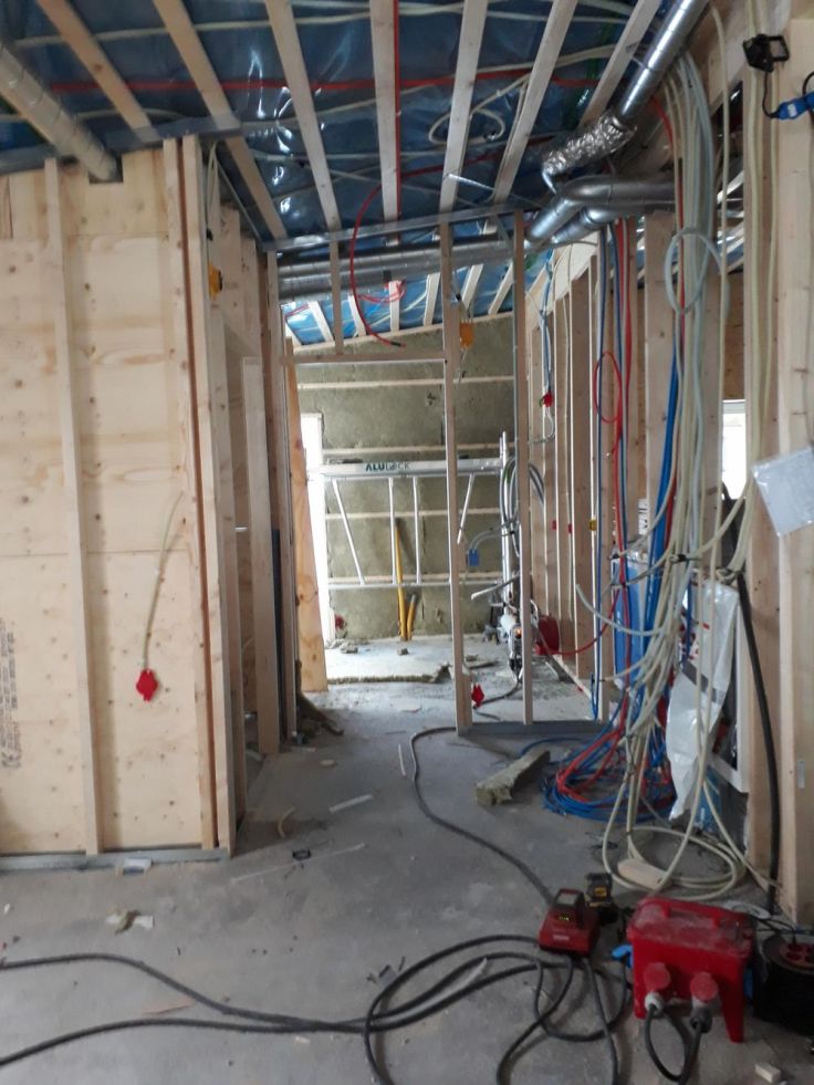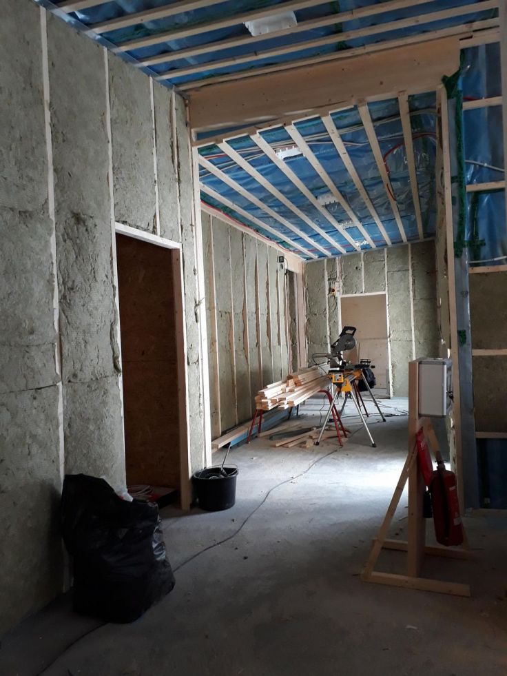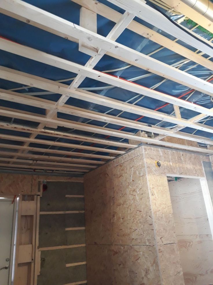 Arbetet de två senaste dagarna har rullat på bra. Jag har nu isolerat alla innerväggar förutom några små ställen där vi måste vänta tills elektrikerna är klara. Nästan alla ytterväggar har också fått sitt andra lager isolering som täcker installationsskiktet, det blir att sätta resterande när elektrikerna är klara med dem väggarna. Joakim har jobbat på med att sätta undertak och nu är det bara undertaket i klädvården kvar sedan är alla undertak satta. Vi kan dock inte börja gipsa dem förrens efter att de har varit och isolerat taket med lösull vecka 12. Joakim har även satt osb i hallen och halva klädvården så det är redo för gipsning av väggarna. Vi har även gjort inkanalen till köksfläkten och imorgon ska vi montera den genom taket, så imorgon blir det att skotta av snön från taket och göra ett hål ner till köket. Vi har även lagt en beställning på skåp till klädvården vilket också kommer vecka 15. Nästa projekt som vi har börjat med nu är att kolla på vitvaror, vilket är en djunel! Det gäller verkligen att jämföra allt såsom t.ex. pris, ljud, hållbarhet och garanti. Så nu har vi lite jobb framför oss. Nu är värmen i huset uppe i 15 grader, vilket innebär att det är samma innetempatur som i huset vi hyr just nu. Dock så känns huset vi bygger i varmare då det är bättre isolerat och inte drar från fönstren.