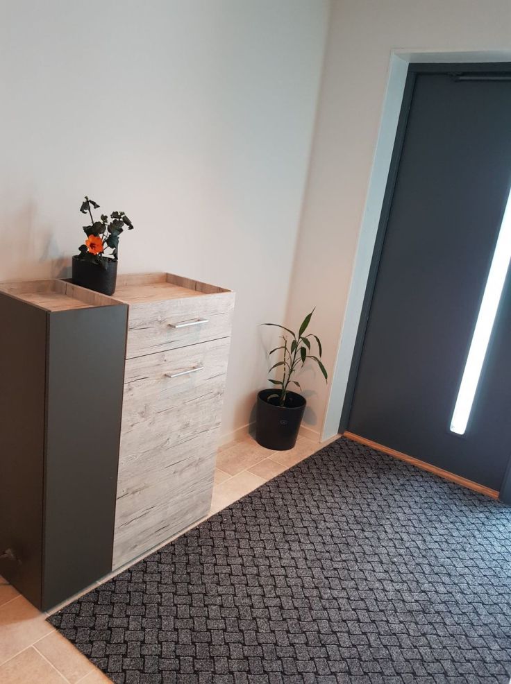 Vi valde att köra en stor hallmatta sĂ„ att alla inte behöver stĂ„ och trĂ€ngas pĂ„ vĂ„r lilla hallmatta med blöta skor. SĂ„ nu kan man gĂ„ lĂ„ngt in med skorna Ă€ven om det Ă€r blött ute för att hĂ€nga av sig jackan eller hĂ€mta nĂ„got man glömt i hallmöbeln. Dessutom sĂ„ kĂ€nns inte hallen lika tom med en stor matta.Â