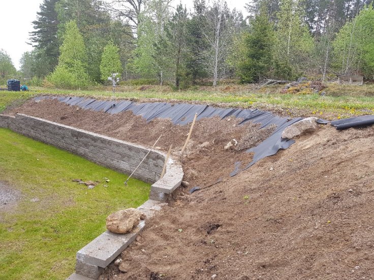 Som rubriken lyder så här vi kommit långt i slänten. All markduk är lagd. Det var en hel del grävande och krattande, men det blev väldigt bra! Idag hann jag till och med att plantera ut en av våra basilikasorter. Tyvärr hade vår dragon och persilja dött pga en frostnatt. Men nu ser det ut som att temperaturen kommer hålla sig på plussidan ☀️