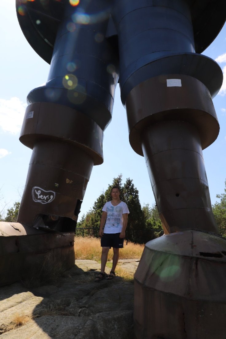 Det var verkligen en godnatt. Vi sov som stockar alla tre, och vaknade upp utan ont i ryggen! 👍 Även denna dag har bjudit på en hel del. Joakim har ringt runt och jämfört försäkringar på den nya bilen så nu är den ordentligt försäkrad. Vi har åkt på utflykt till Fun City vilket är en nedlagd nöjespark. Tyvärr hade de hunnit riva en hel del för det ska bli ett bostadsområde men det var ändå häftigt att gå där. De hade fortfarande kvar sin staty. Gå på upptäcksfärd med barnvagn är inte det lättaste, det blev lyft och terrängkörning. Vi kunde inte ha bärselen eftersom det var 32 grader och hade vi svettats ihjäl.
