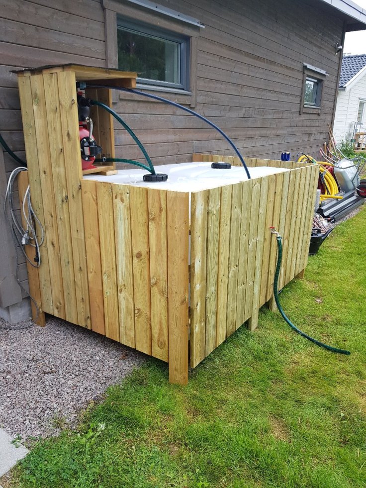 Joakim var och hämtade fler brädor, kopplade in hydroforpumpen, fick åka och byta den då gängornq gick sönder men efter två vändor in till stan så kunde han äntligen göra klart. Så nu kan vi använda det regnvatten vi samlar upp