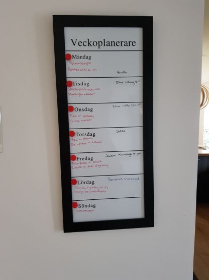 Då har ännu en regning dag snart passerat. Men vi surar inte för det. Vi har lyckats sysselsätta oss ändå. Ni kan säkert gissa vad Joakim har haft för sig. Precis, han har hållt på med sin fräs. Jag har knappt sett honom under helgen och när jag väl har sett honom gissa vad han har prastat om. SIn fräs… gissa om jag håller på att bli lite smått galen på den😅 Jag har varit inne ett tag nu på att köpa ett nytt vitrinskåp till vardagsrummet och nu har jag kikat ut ett fint på mio som jag vill ha. Det kan bli jättebra. Det är snyggt, har mycket förvaring och gör att vi kan ändra om i våra andr köksskåp för att få lite bättre ordning. Ja, jag gillar ordning. Apropå ordning så har jag gjort en matsedel för nästa vecka. Jag ska försöka göra en varje söndag för kommande vecka. Jag blir så trött på frågan ”vad ska vi äta”, det är så mycket smidigare att ha en matsedel och köra på den. Vi får se hur länge jag kan hålla det uppe. Men nu är nästa veckas matsedel uppe på veckoplaneraren.