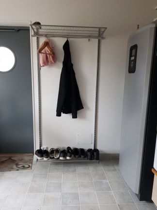 Hatthyllan och skostället är nu också installerade i tvättstugan/groventrén. Så nu slipper vi kliva på alla skor på mattan när vi går in. Så bra blev det! Det är så smidigt med elfasystem.