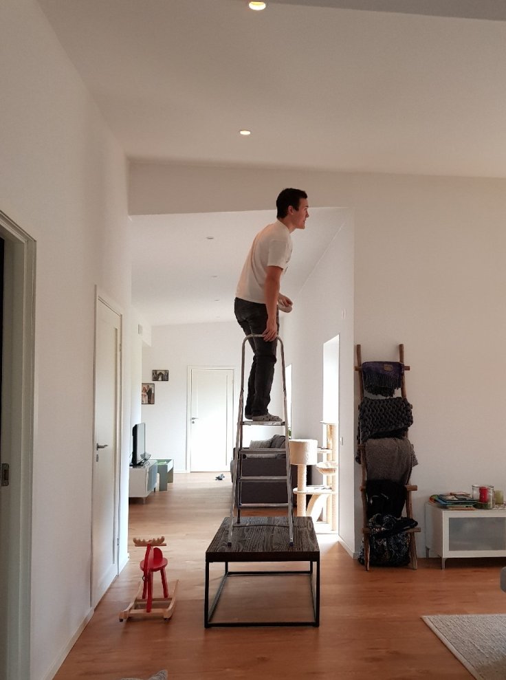 Idag har det varit fullt upp hela dagen. Jag gick upp en stund innan Joakim och Melissa för att hinna sitta och skriva lite. När de vaknade så var det bara att äta frukost och plocka iordning lite innan jag trotsade träningsvärken genom att åka och träna ett Cx-work pass👍 Det kommer kännas i bålen imorgon😅 När jag kom hem blev det bara in i duschen, mata Melissa och läsa lite för henne så hon somnade. Under tiden så häll Joakim på att foga i sprickor som vi fått i huset mellan vägg och tak. Det blir ju alltid lite sprickor när huset sätter sig, men nu är de åtgärdade! Såhär kan det se ut när man har högt i tak 😂