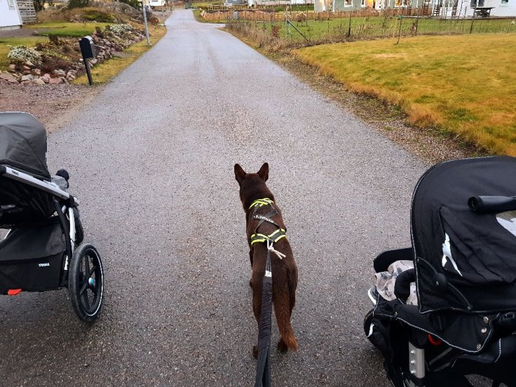 Efter mycket om och men så lyckades Melissa somna igår efter att jag fått köra henne i vagnen fram och tillbaka i tvättstugan. Men trots det var det upp tidigt som gällde för att hinna med en löptur innan vi skulle få gäster. Det blev en 5 km lång runda tillsammans med grannen med dotter och hund. Så vi var tre vuxna, 2 barn i barnvagn och en hund. Jag fick springa med Helix, så jag fick extra draghjälp och även träna bromsmusklerna. Speciellt när han han fick syn på ett rådjur😅