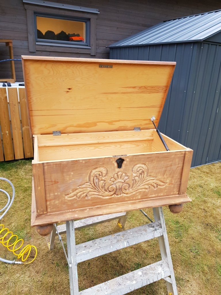 Efter en stor mängd sand i hårbotten så var lacken borta👇 Dock fick jag inte bort all lack men det fick duga eftersom kistan bara åt upp sandpappret.