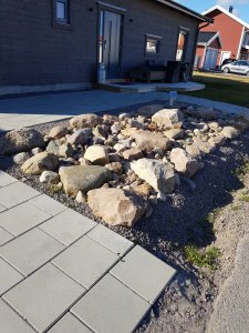 Idag tog vi tag i vårt kära stenrös på framsidan. Vi har länge gått och funderat lite på hur vi vill ha det, och tillslut kom vi på att vi ville ha en liten murkant så det blir ett tydligt avslut av stenröset.