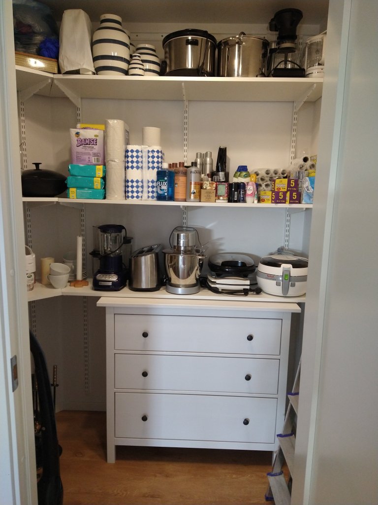 Både jag och Joakim var hemma idag så han spenderade självklart den tiden i garaget, någon som är förvånad? Nej, skulle inte tro det. Jag däremot tog i itu med att omorganisera och utrensning i vårt förråd i huset. Bland annat så fick en byrå som bara stod i ett tomt rum flytta in dit för förvaring av småprylar. Så skönt att få upp allt som tidigare stod på golvet. Det som återstår nu är bara göra iordning i lådorna i byrån. Men det sparar jag till en annan dag🙂