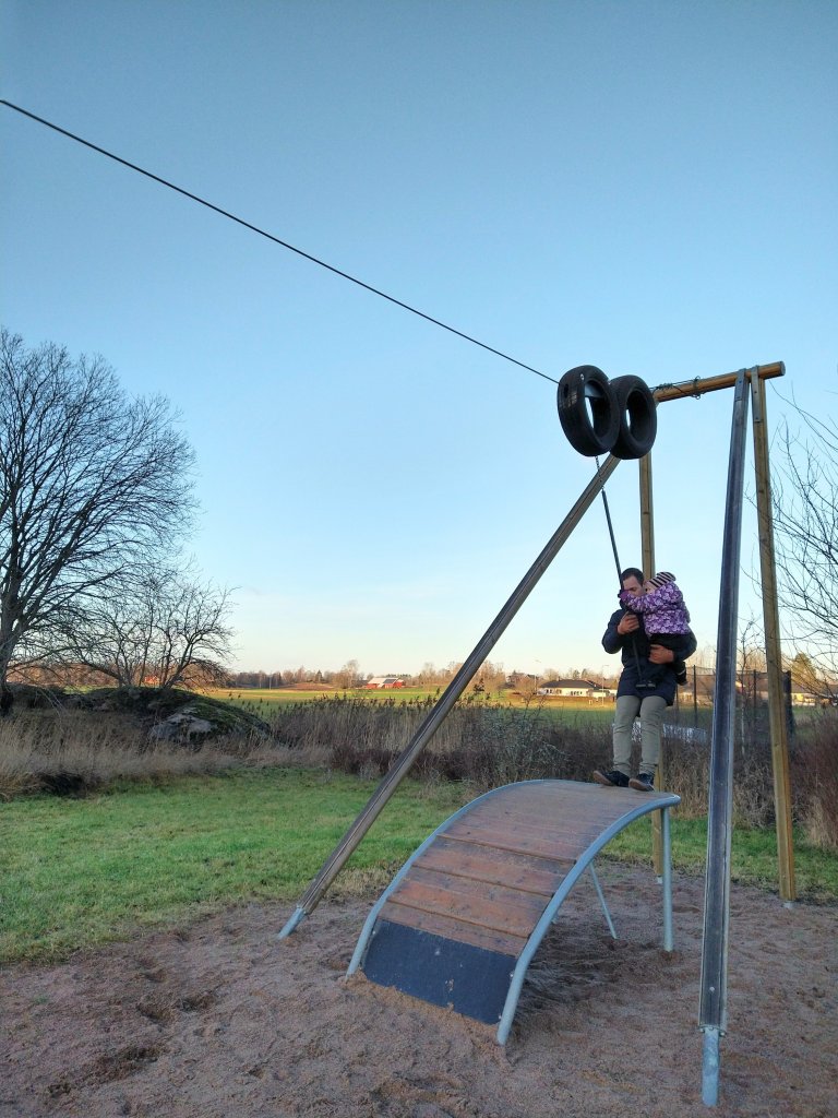 Dan för dopparedan bjöd på strålande sol ☀️ Helt underbart, det var bara synd att det inte var minusgrader och snö också! Men man kan inte få allt man vill ha här i livet. Efter frukost tog vi oss ut till lekparken. Det blev rutschkana, linbana och springa upp och ner för den lilla kullen.