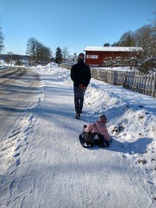 På eftermiddagen blev vi bjuda på fika utomhus hos en granne. Deras dotter går på samma avdelning som Melissa på förskolan och båda är just nu hemma pga att de är snoriga så vi tänker att det funkar att träffas ute ändå. Barnen har ju säkert samma baciller och vi var ju ändå ute. Så det fick bli årets första semla utomhus i solen☀️ Joakim gick leka av sig med deras hundar och Melissa och Nelia åkte kana nedför en snöhög på tomten. Så kul att kunna umgås med lite andra utomhus, det har blivit väldigt ensamt hemma nu det senaste.