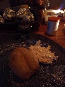 Tror också ni har samma baciller så det var nog ok att vara ute ihop. Semla lät gott, så det blir en på tisdag är tanken. Vi åt också bakpotatis idag då vi var ute och åt