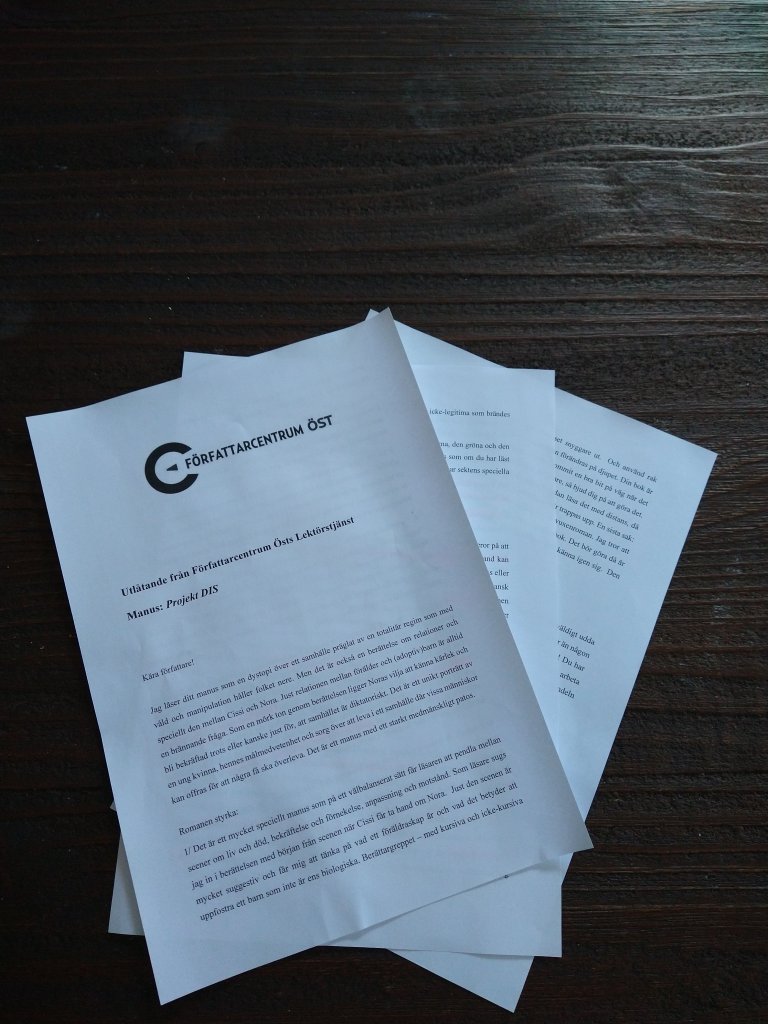 ”Jag har läst ditt manus med stor glädje. Du har en egen stil och en historia som är väldigt udda men på ett bra sätt. Att hitta något alldeles eget i ett land där det kommer ut fler böcker än någon har tid att läsa, är skickligt och tyder på kreativitet och fantasi. Ditt manus sticker ut! Du har dock en bit kvar innan manuset är flygfärdigt. Rusa inte fram utan ge dig tid till att arbeta långsamt och metodiskt så tror jag att du har alla chanser att få se ditt manus/bok i bokhandeln framöver. Lycka till”