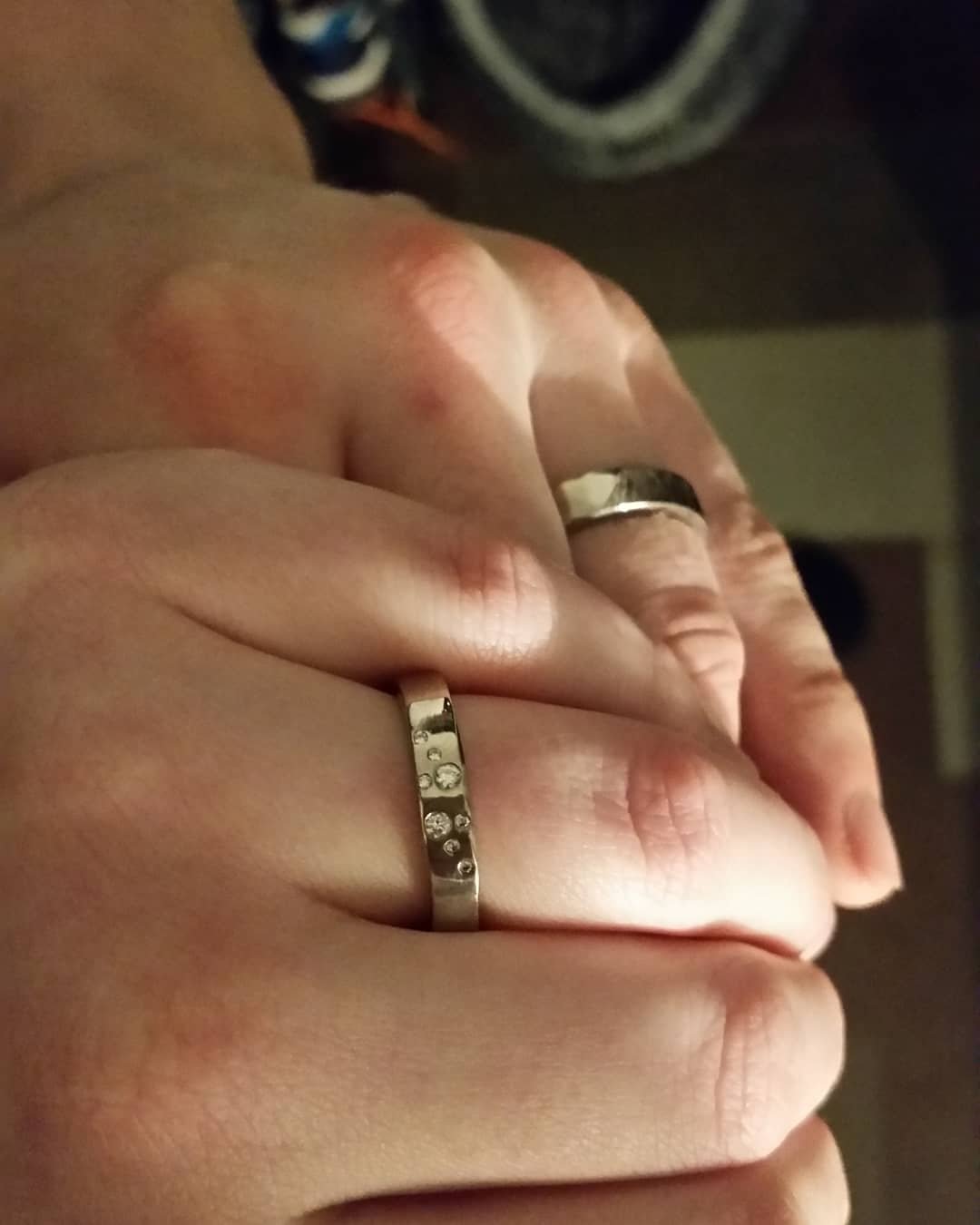Min nuvarande sambo och jag började med en tatuering 2009 som ”förlovning, men den riktiga med ringar blev 2012. Smyckedesignern Lotta Dijou har designat våra silverring som är i form av en vinge. Tror faktiskt min sambo jobbade i baren på festivalen när vi förlovade oss. Men varför vi inte förlovade oss när vi båda var lediga vet jag inte här heller.