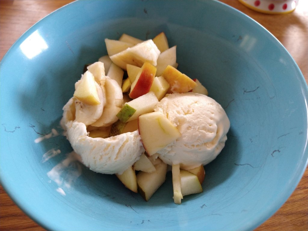 Idag fick det bli fruktsallad och lite hemgjord glass som jag slängde ihop efter jag lämnat Melissa på förskolan. Vårt porslin börjar se väldigt tråkigt ut nu, det var det vi köpte när vi flyttade hemifrån 2014 så det börjar väl bli dags att byta ut. Men det får vänta tills barnen blivit äldre.