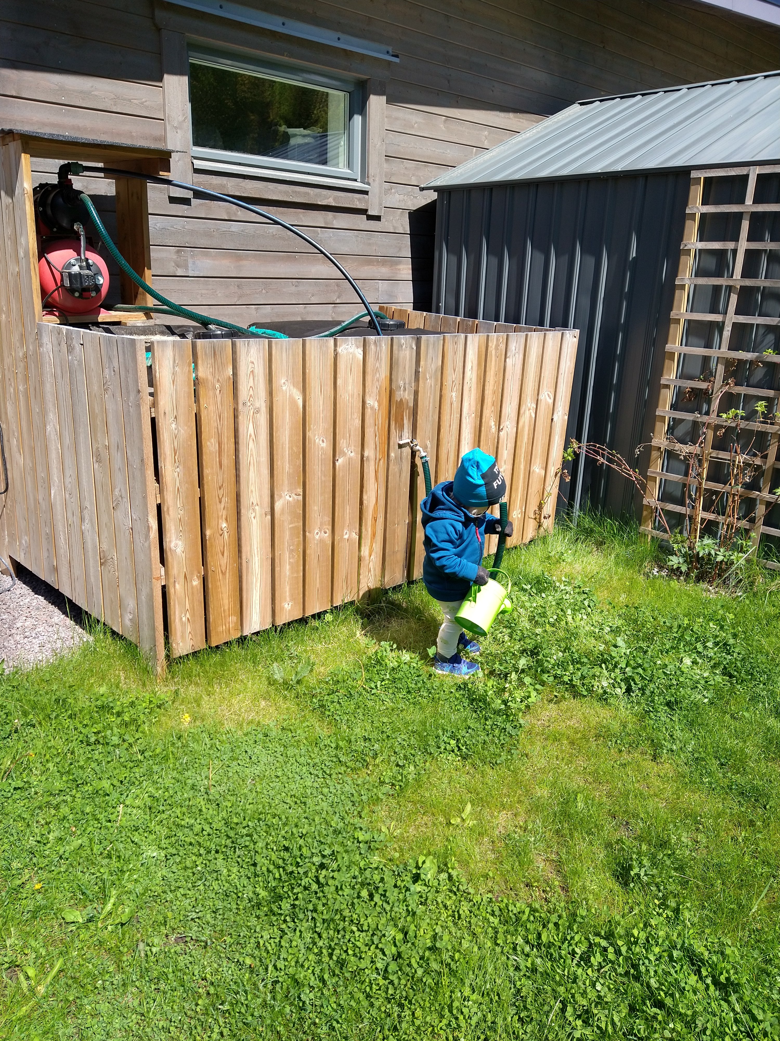 Tänk att denna grådassiga vecka får avslutas med en solig fredag. Självklart tog vi tillfället i akt med promenader, cykling och lite trädgårdsfix. Tomatplantorna fick nya krukor och Melissa lekte loss med vatten från våra vattentankar.