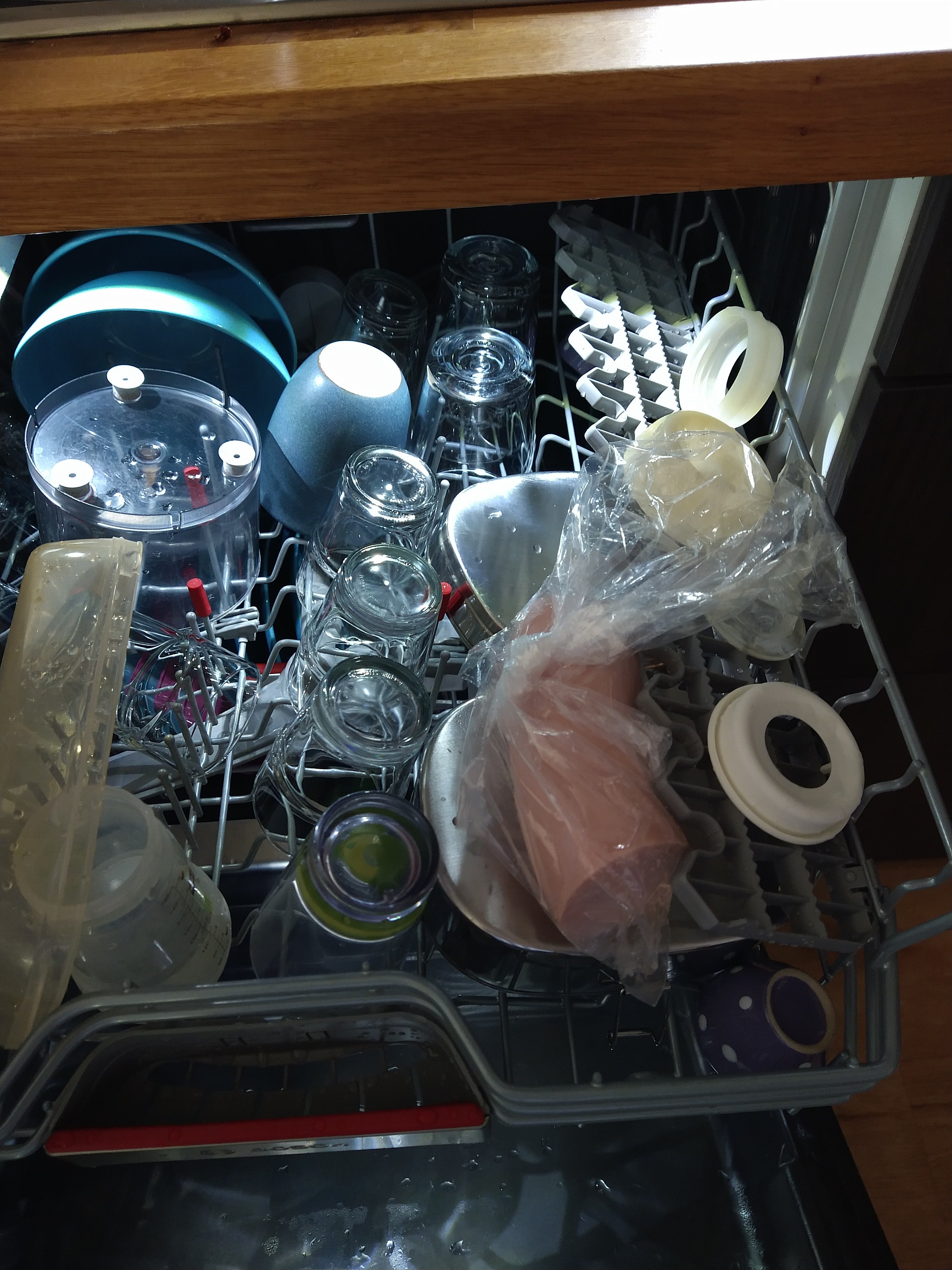 Vi brukar alltid öppna vår diskmaskin lite och låta disken svalna av innan vi tömmer den. Joakim tyckte det var ett perfekt ställe att tina falukorv, och ja det fungerade ju bevisligen väldigt bra!