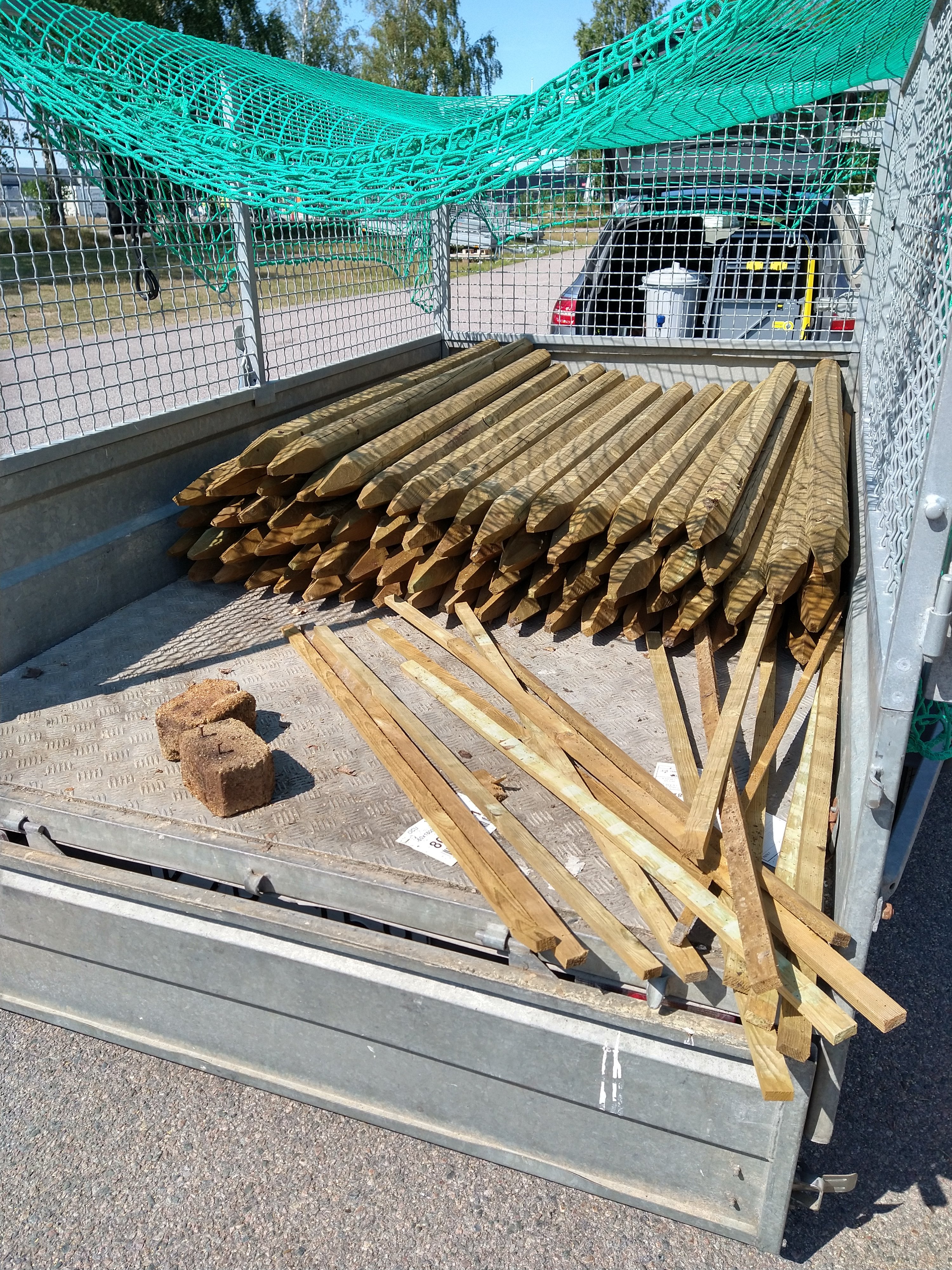 Ny vecka och vi började med att fixa lite måsten, som bland annat ordna med försäkring och fästingmedel till Bartolo. Vi drog även igång med nästa projekt – staketbygge. Så åkte till Granngården i Motala, och köpte staketstolpar. Självklart skulle även Melissa hjälpa till att lasta.