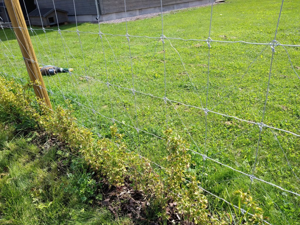 I måndags eftermiddag hade Joakim köpt mer ståltråd och efter regnar hela dagen var vädret på vår sida så vi gick ut och ”sydde” klart den sista biten av staketet. Vilket blev jättebra! Den smala ståltråden är stark och smälter in i omgivningen så man ser den bara från vissa håll. Vi har bara ”sytt” de tre raderna i mitten för det var där Bartolo tog sig ut innan. Så testar vi att ha det såhär så får vi se om han lyckas ta sig ut igen eller inte. Den närmaste tiden får han även ha på sig selen i trädgården så han får svårare att ta sig ut, och om han skulle lyckas så blir det lättare att få tag i honom.