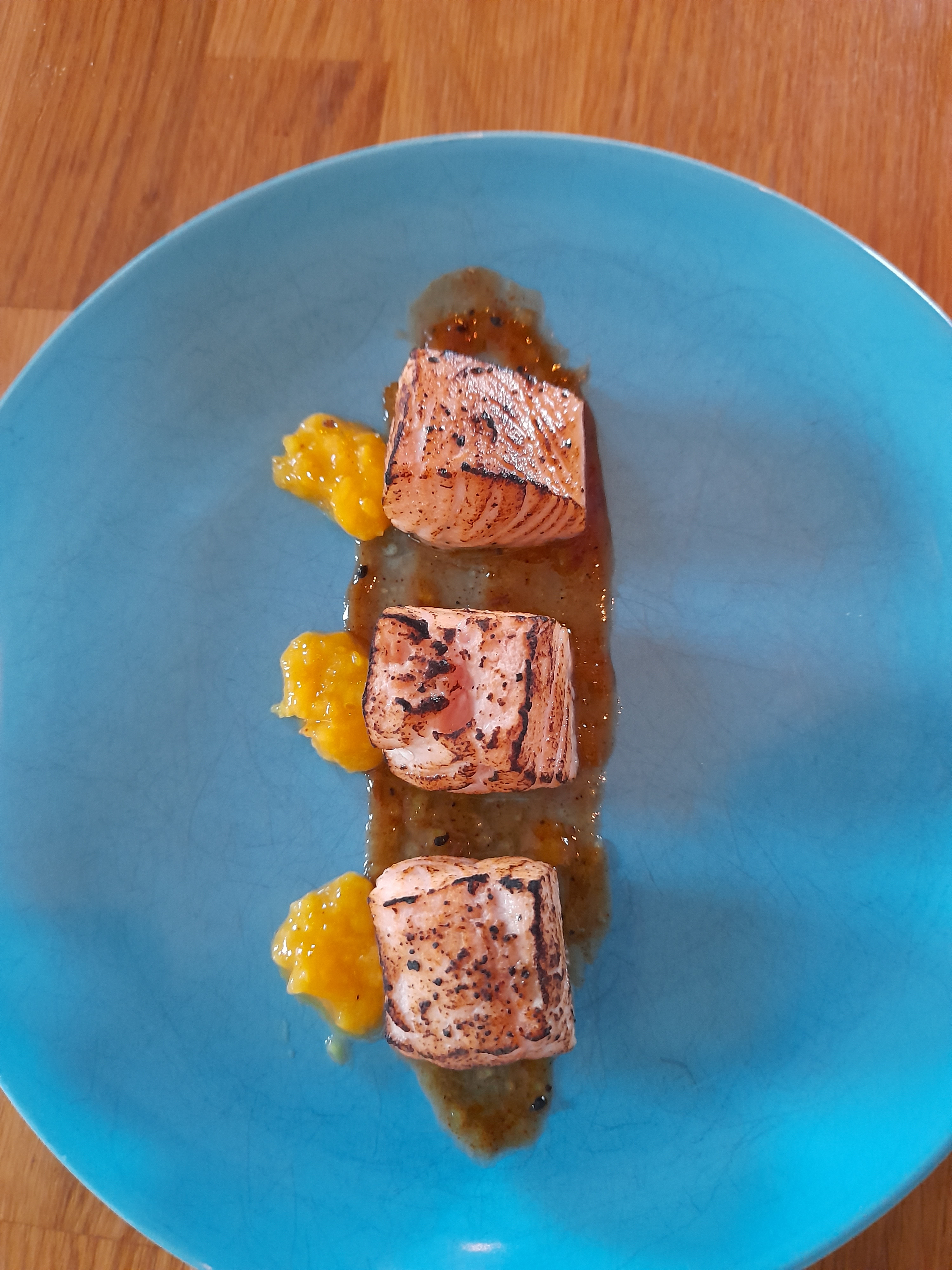 Förra veckan var Joakim på en lunch för nyföretagare som kommunen bjöd in till. Då blev de bjudna på trerätters, och han blev väldigt förtjust i förrätten så vi bestämde att vi skulle testa göra den hemma. Sotade laxtärningar med mangokräm. Riktigt gott! Passade ju perfekt att testa idag när vi ändå skulle göra laxpasta till lunch.