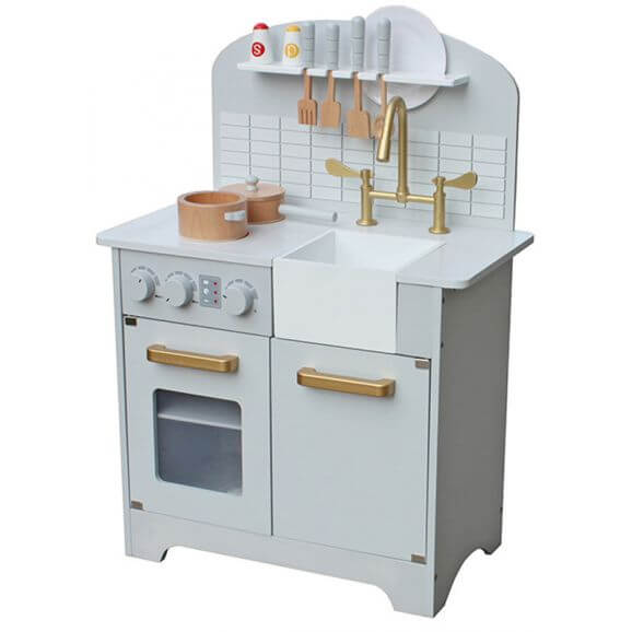 Ett leksakskök ger utrymme för mycket lek – både på egen hand och tillsammans med andra. I vårt leksakskök här hemma har det bjudits på många mysiga och lärofyllda lekstunder. För barnet är ett leksaksköket även ett roligt och pedagogiskt sätt att träna motorik och ord kring matlagning, utveckla sin fantasi och matnyttiga kunskaper inför senare i livet. Leksaksköket Trendy är ett modernt och välutrustat leksakskök med fina gulddetaljer. Köket är gjort i trä för att klara av många lekstunder och hålla länge, dessutom blir det en väldigt snygg inredningsdetalj i barnrummet. För den som vill ha ett lite mer stilrent kök så finns leksaksköket Wilma. För båda köken ingår en del köksredskap, men sedan finns det ett stort utbud av tillbehör som går att köpa till. Det är detta som jag tycker är extra roligt med leksakskök, det finns så många möjligheter och går att variera. Leksaksmat, köksutrustning och för den lille bagaren finns det även ett bakset med 16 delar. Allt för att skapa en rolig lekstund!