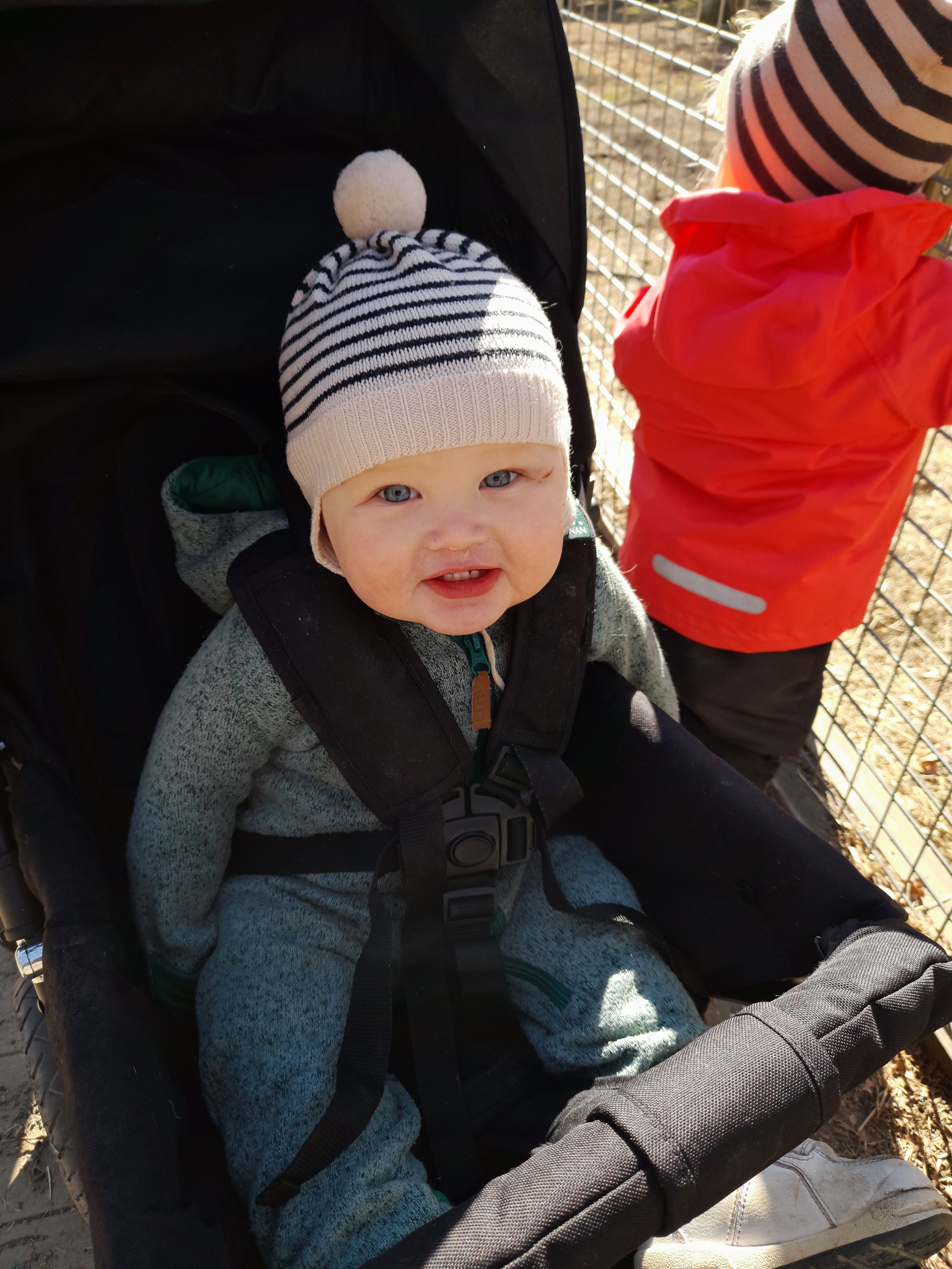 Den här helgen har vi varit ute på vift, eller rättare sagt nere i Jönköping. Igår gav vi oss av efter frukosten och mötte upp mina föräldrar i stadsparken. Där gick vi runt och kikade på djuren, vilket både barnen och Bartolo tyckte var väldigt intressant. Efter en liten promenad bland hagarna gav vi oss ner till ankdammen och matade dem med lite bröd. Melissa var helt lyrisk när de kom och åt maten. Det var riktigt skönt när solen var framme men annars blev det lite kyligt så fikan fick bli vid ett soligt bord. Efter en god fika fick båda barnen gunga en stund innan det var dags att röra oss hem till mina föräldrar.