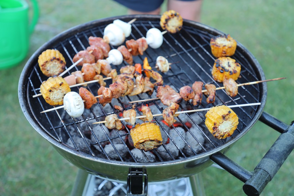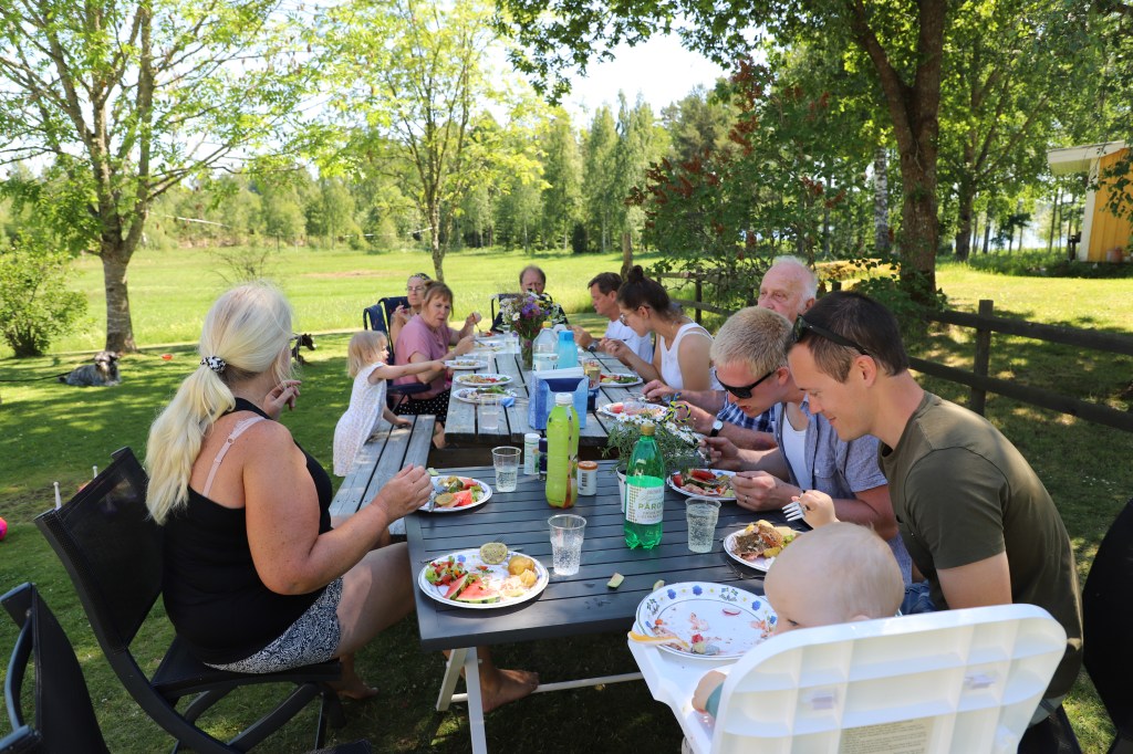 När vi tog oss upp till huset igen matade jag Wilhelm så han kunde gå och lägga sig. Melissa och John var i fullt tjo att leka, några satt och njöt i skuggan och grillarna tändes. Det blev enkel mat i form av grillspett och potatissallad. Smidigt när alla kan göra sina egna spett.