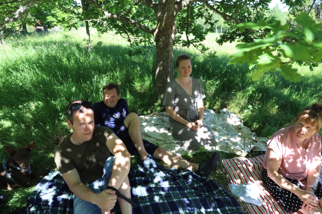 Vid tretiden var det dags för det traditionella midsommarfirandet. Flera får närliggande stugor kom till gräsplanen framför huset. Vi hade lagt ut filt i en skuggig plats under ett träd och under några satt under en del av partytältet. Midsommarstången restes och det blev lite dans. Jisses vad varmt det var! Melissa fick avbryta för hon blev alldeles för varm. 28 grader, sol och dans är ingen perfekt kombination. Det blev bara två sånger sedan var det tillbaka till skuggan som gällde för alla. Den medhavda fikan intogs och det såldes lotter. Alla intäkter som de får på midsommarfirandet går till underhållet av vägen. Vi vann inget, men min mamma och Linda gjorde och vinsterna blev mer vattenpistoler. Ja, ni kanske kan tänka er att de kom väl till användning senare sen. Efter det var dags för auktioner, folk som skänkt saker som ska auktioneras ut. Bland annat var det väldigt fina hemgjorda fågelholkar.