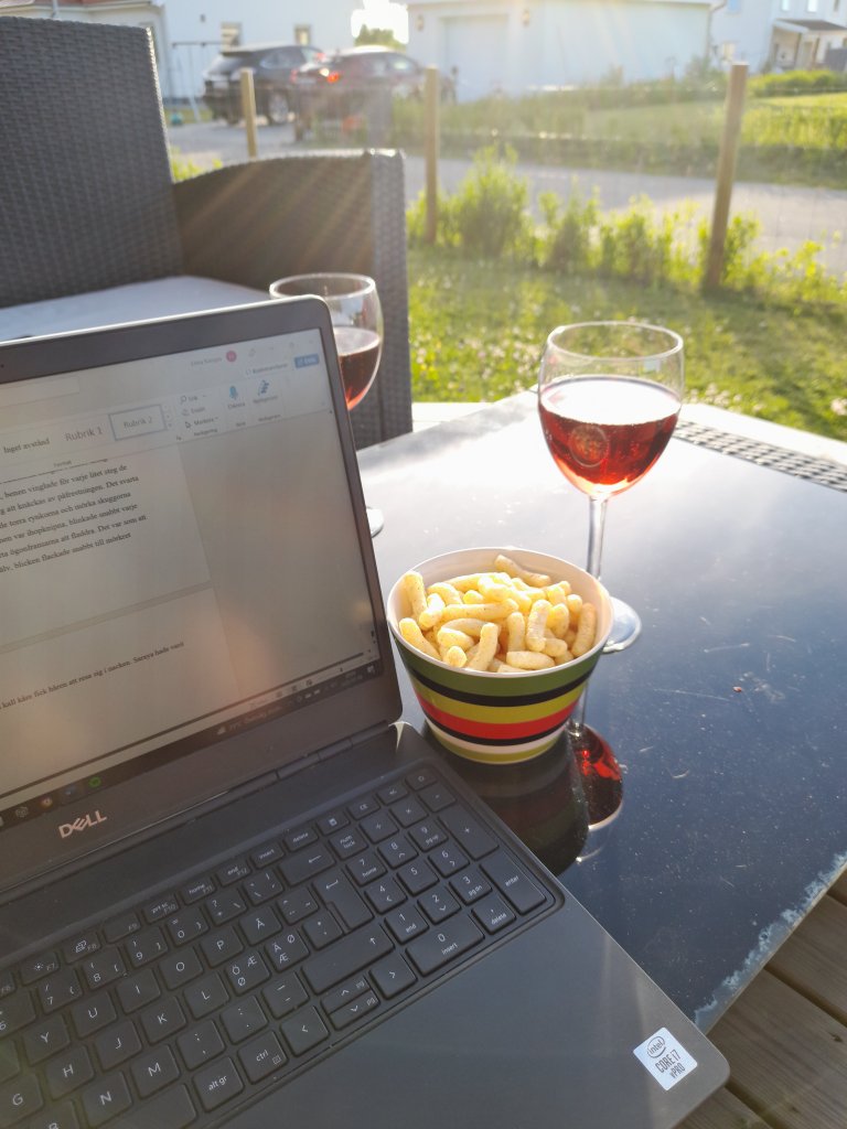 Idag skulle det egentligen varit min sista dag på jobbet innan semestern, men av förklarliga skäl blev det inte så. Så jag fick inte den där ”Nu går jag på semester”-känslan. Men vi firade in semestern lite nu på kvällen med att lite kvällsmys ute i solen. Då passade jag även på att skriva några rader på manuset och nådde därmed veckans mål i skrivandet.
