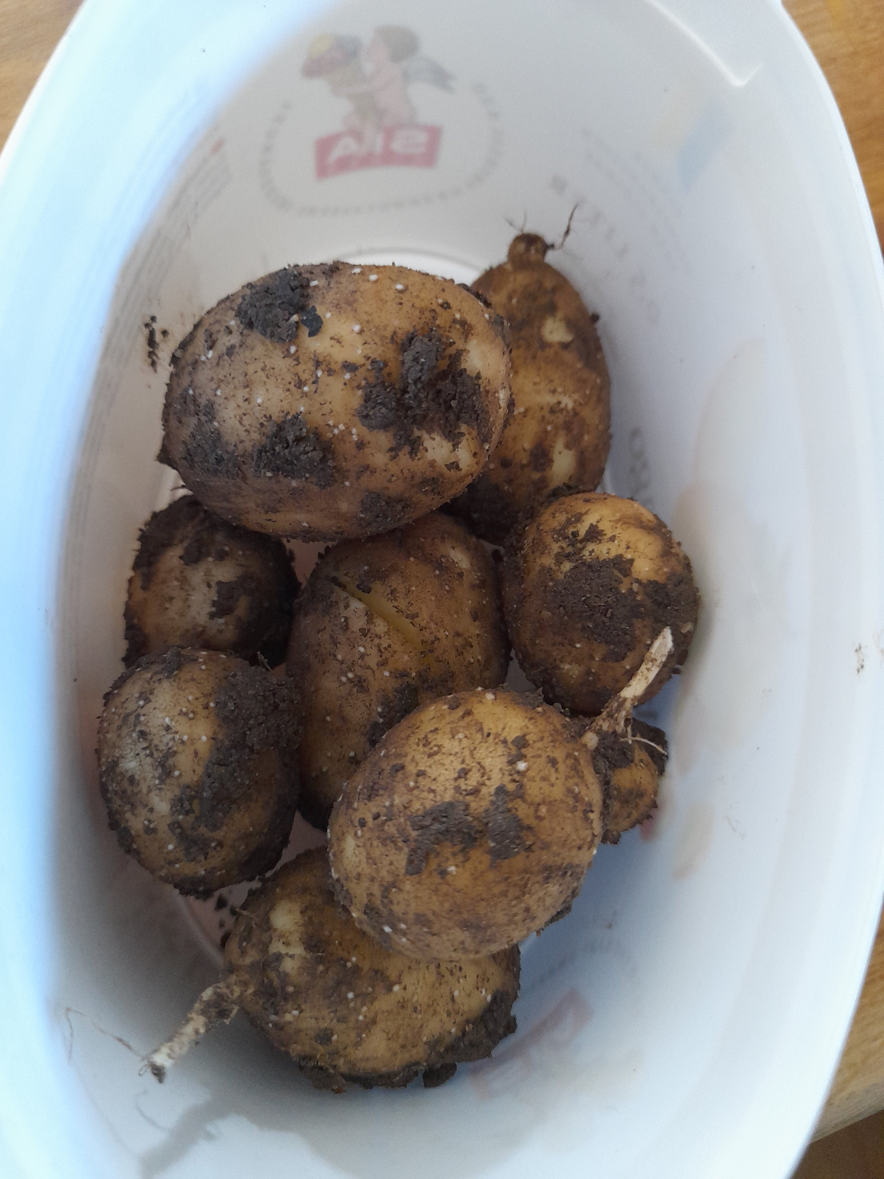 Efter lunch och Wilhelm var lagd för lunchvila satte vi oss på altanen och rensade bären. När vi ändå hade ångan uppe fortsatte vi i trädgården med att skörda av en del oregano, dragon och citronmeliss som nu är på torkning. Gallring bland morötterna blev av, de där små morötterna är så smakrika och goda. Nästan bättre än de stora om du frågar mig, så under eftermiddagen har det knaprats en hel del. Några av potatisarna fick följa med in när vi grävde i jorden för att se om det hade vuxit något därunder jorden. Väl inne igen slängde jag ihop en pesto på morotsblasten, så nästa vecka får det bli lite mat som passar ihop med den!