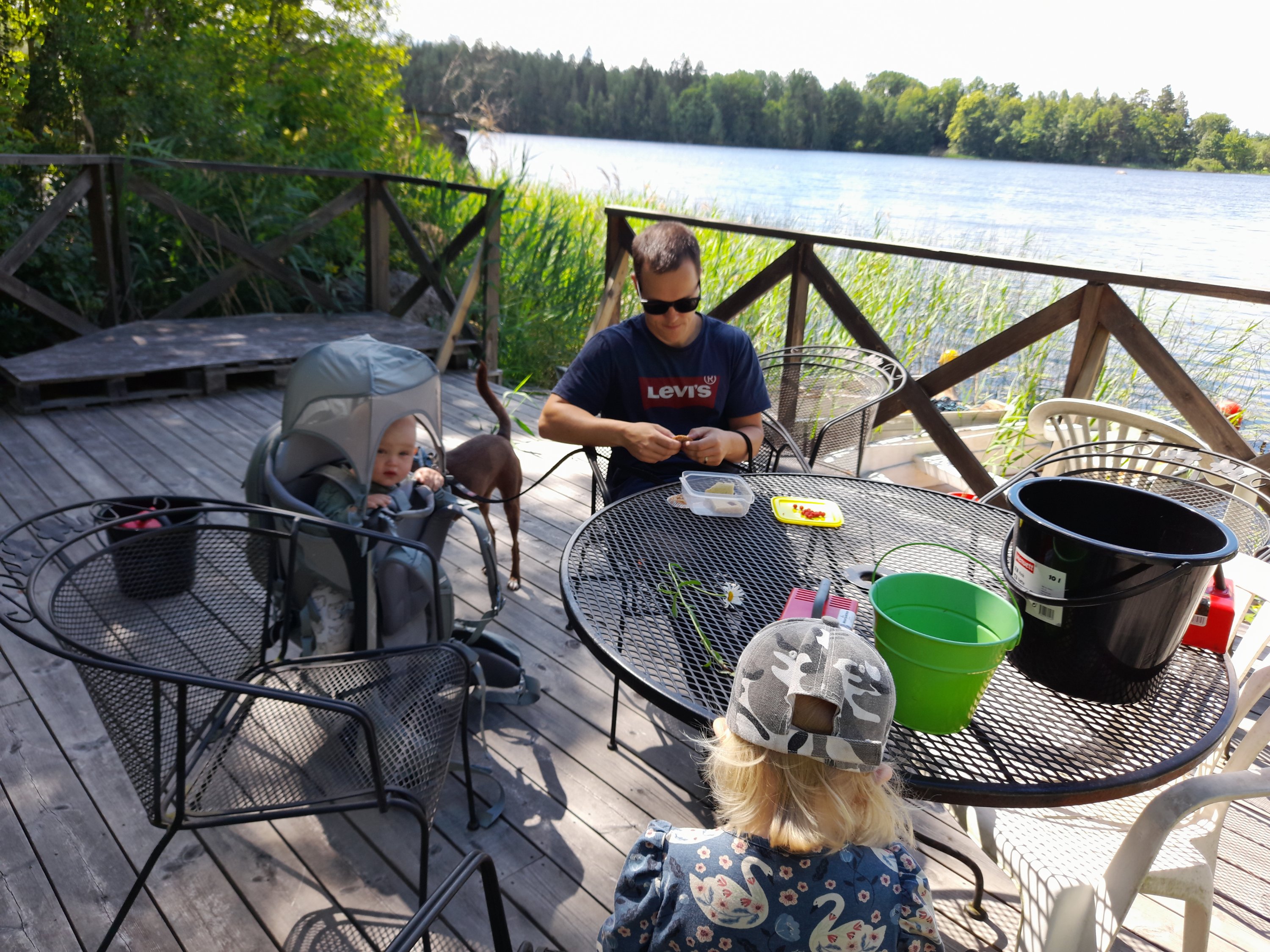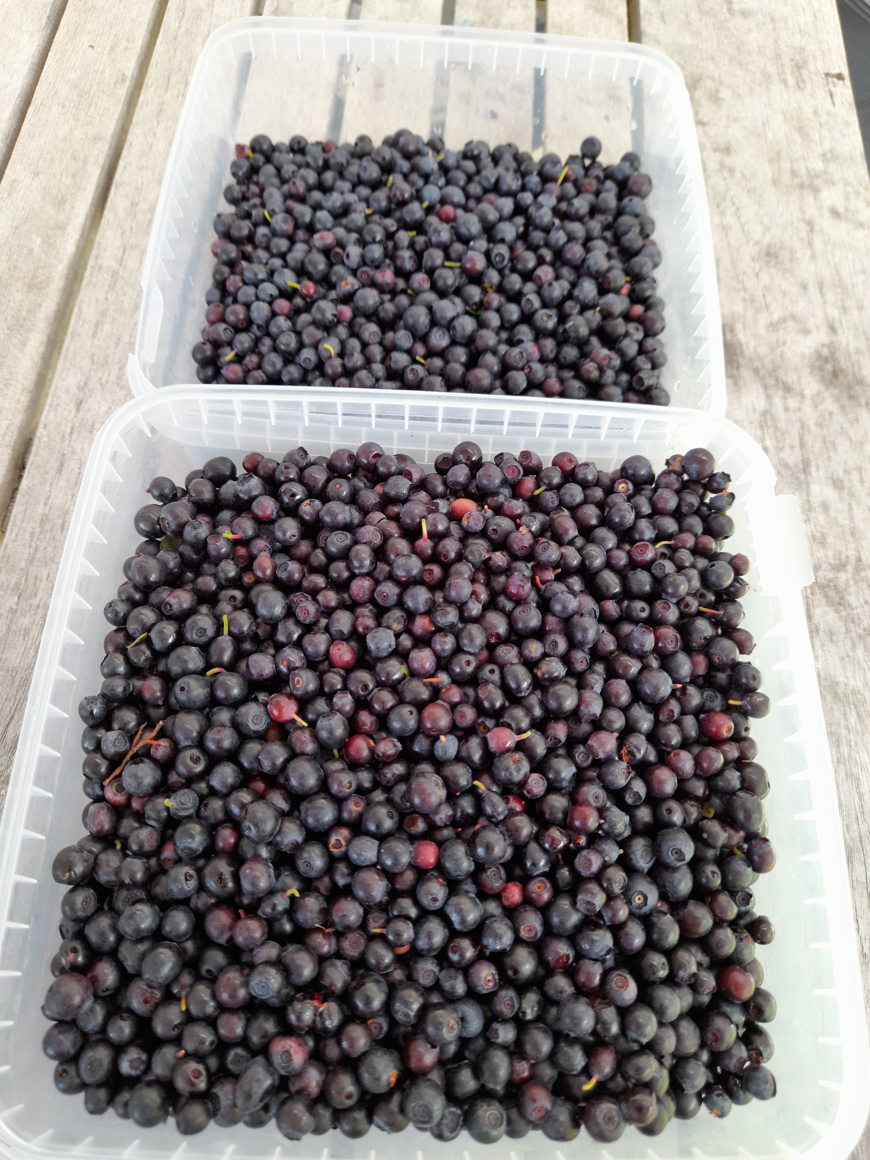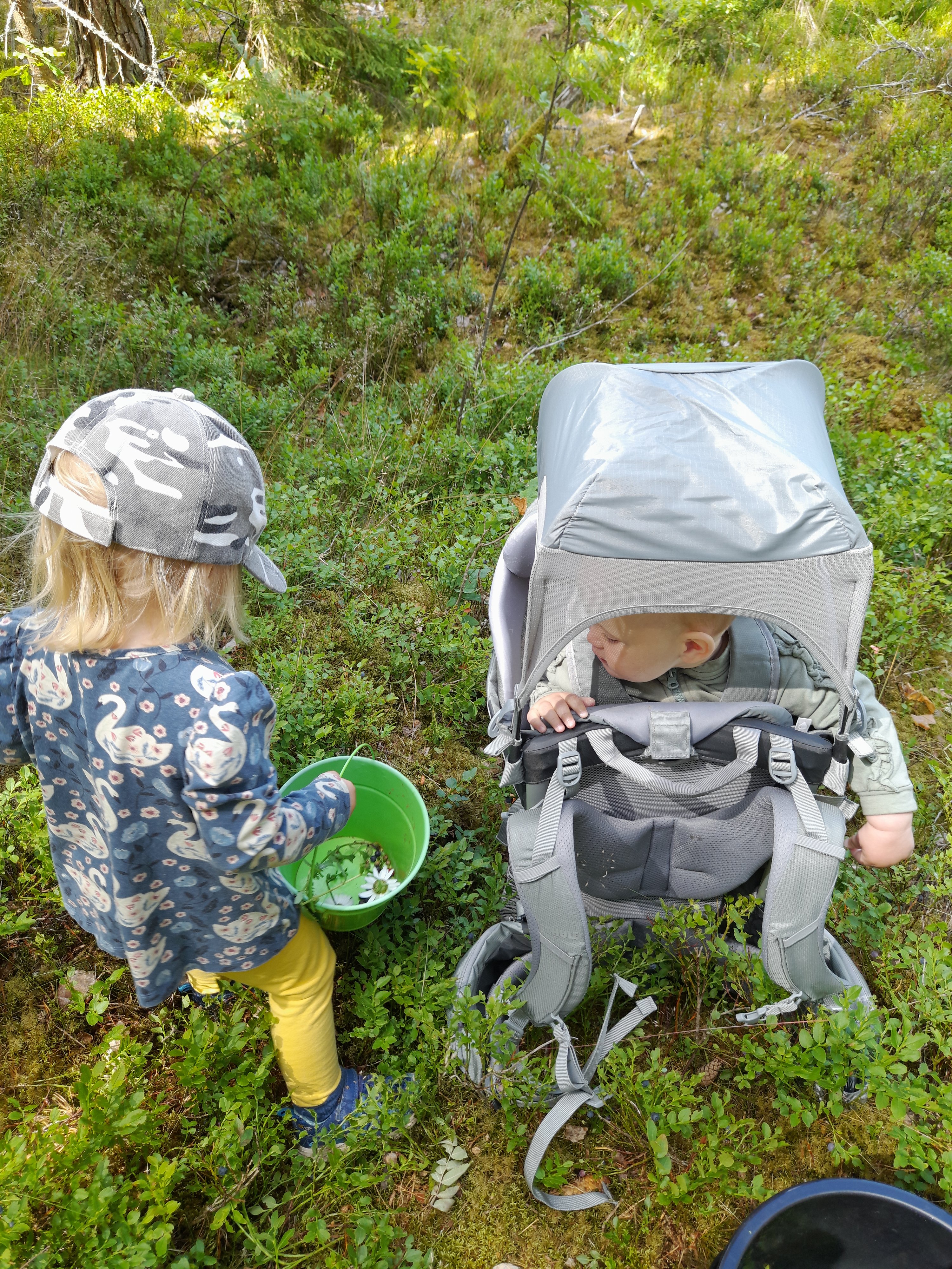 Idag visade det sig att även Wilhelm har åkt på ögoninflammation. Men båda barnen var pigga och även om det fortfarande rev ordentligt i halsen så kliade rastlösheten i kroppen. Joakim fick till och med ett ryck och städade ur kylskåpet efter frukost. Under förmiddagen satte vi oss i bilen och åkte ut för att leta lite blåbär. Vi tog oss bort till Storsjön och där kunde vi plocka på oss 3 liter bär och Melissa och jag plockade även lite blommor Det blev en fika nere vid vattnet innan vi plockade en liten stund till innan vi åkte hem och åt lunch.