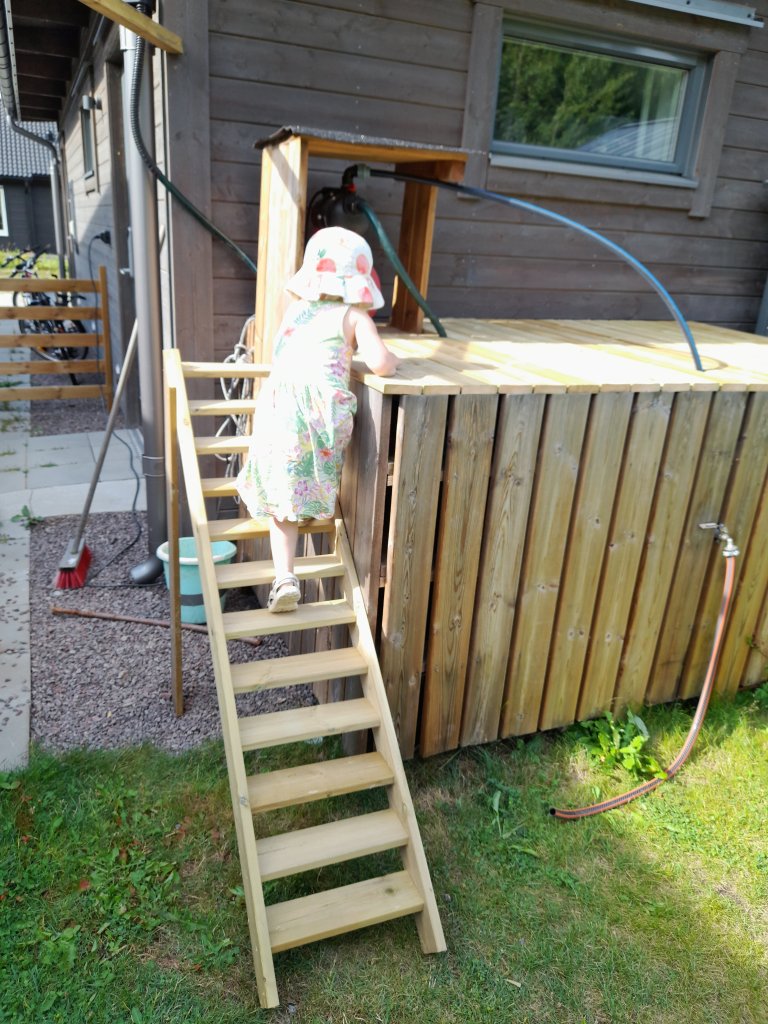 Efter lunch var det baddags, efter det ville Wilhelm sova en stund och Melissa och Joakim tog det lugnt framför tv:n och jag kunde hålla på med mitt skrivande. Sedan blev det mellanmål och en promenad som i vanlig ordning slutade inne i trädgård med att smultronplockning. Arbetet med hundgården går framåt och igår byggde Joakim en trappa upp till vattentankarna där Bartolo får ett litet utkiksdäck tror den här hundgården kommer att bli suverän! Melissa har också godkänt trappan.