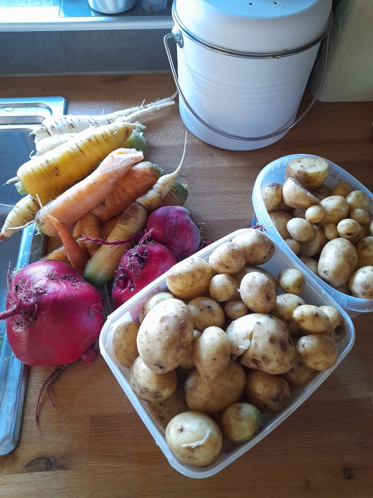 Söndagen bestod att fixa allt som skulle göras under helgen. Panera matsedel för kommande vecka, handla mat, tvätta och städa undan allt som dragits fram under veckan. Efter en längre lunchpromenad fixade vi hundgården då det behövdes förstärkas med det grövre nätet på ytterligare ett ställe. Vi passade även på att skörda en del i landet. Potatis, lök, rödbetor, morötter och palsternacka fick följa med in i huset. När vi ändå var igång drog vi av ogräset och vände på jorden. Nu återstår bara purjolöken och grönkålen i landet. Vår grönkål har börjat komma igen nu efter att den blev angripen av skalbaggar. Så nu hoppas vi på mycket grönkål igen!