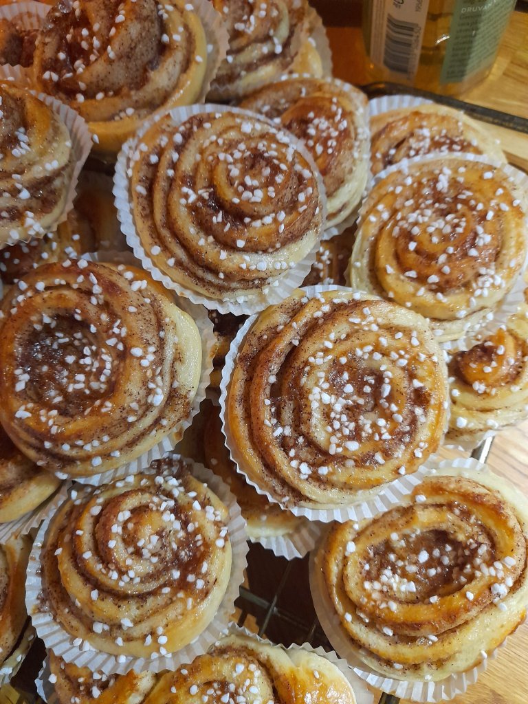 Det har varit två dagar i bakandets tecken. Gårdagens kanelbullar blev riktigt smaskiga och hur kan de inte bli det när alla hjälptes åt med att göra dem. Så himla mysigt att baka med barnen, och Joakim kom hem i perfekt tajming så att han kunde hjälpa till med pensling och socker.