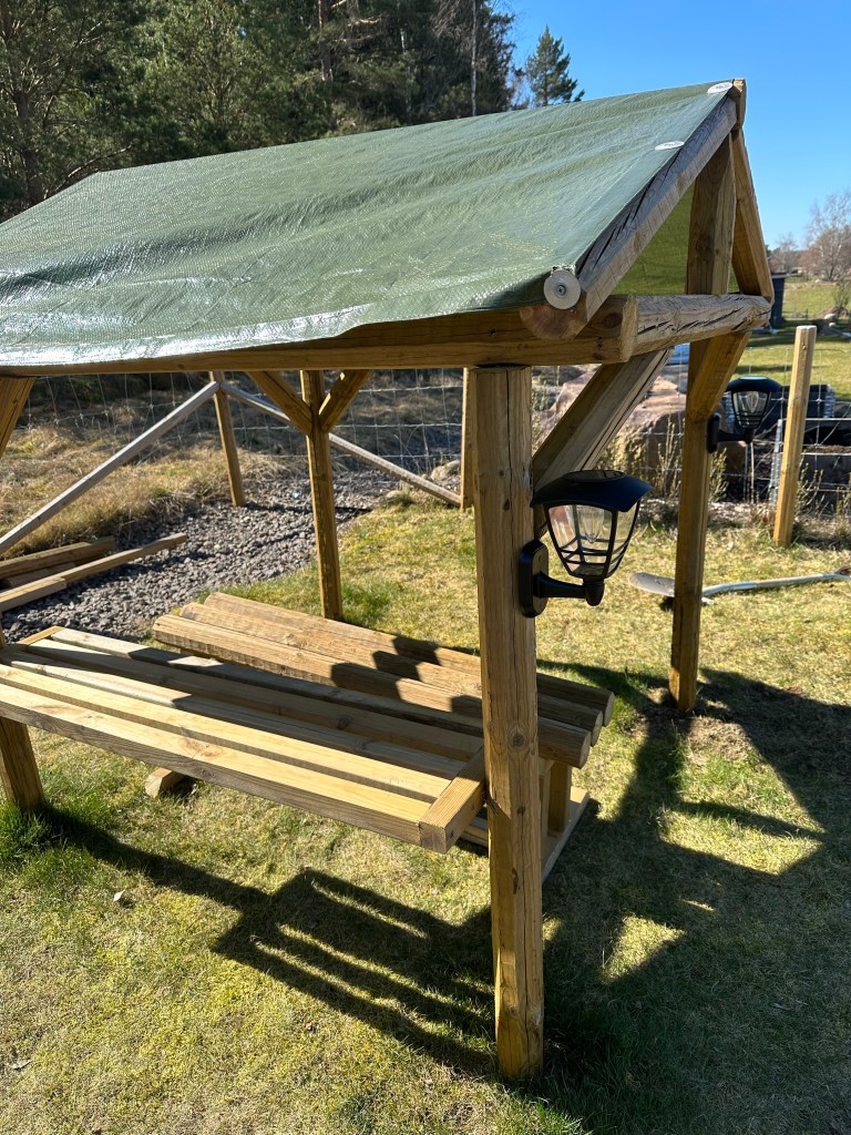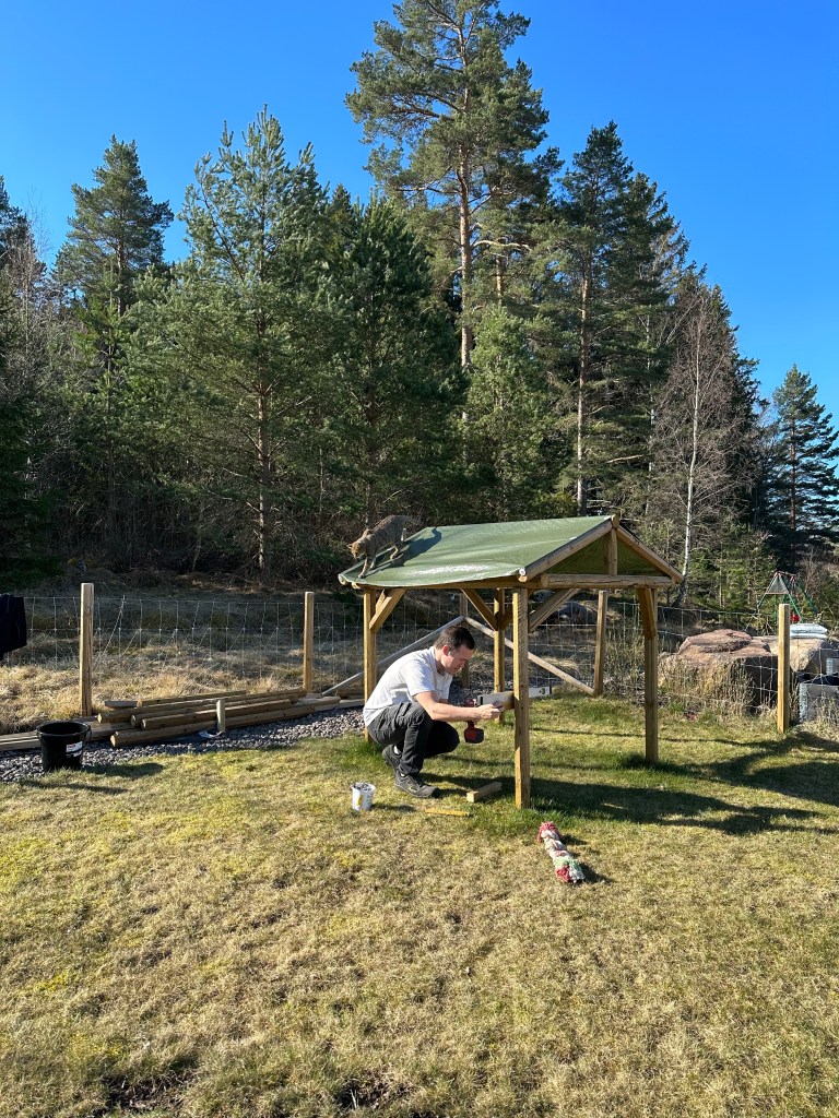 Alltså vilket väder det har varit idag! Fullkomligt underbart! Direkt efter frukost gav vi oss ut i trädgården. Sopa garageuppfart, rensa ogräs i häcken på framsidan och bygga i kojan stod på agendan. Med lurar i öronen och en ljudbok gav jag mig på att sopa medan Joakim och barnen började i kojan. Jag fick snabbt skippa den långärmade tröjan då det blev alldeles för varmt. När uppfarten var sopad var det bara att ge sig på ogräset. Där fick jag hjälp av barnen som sprang mellan mig och Joakim och hjälpte till. Kojan fick sig ett bord som vi redan nu har lekt affär vid, en bänk och solcellslampor. Givetvis invigdes det med glass och saft när allting var klart!