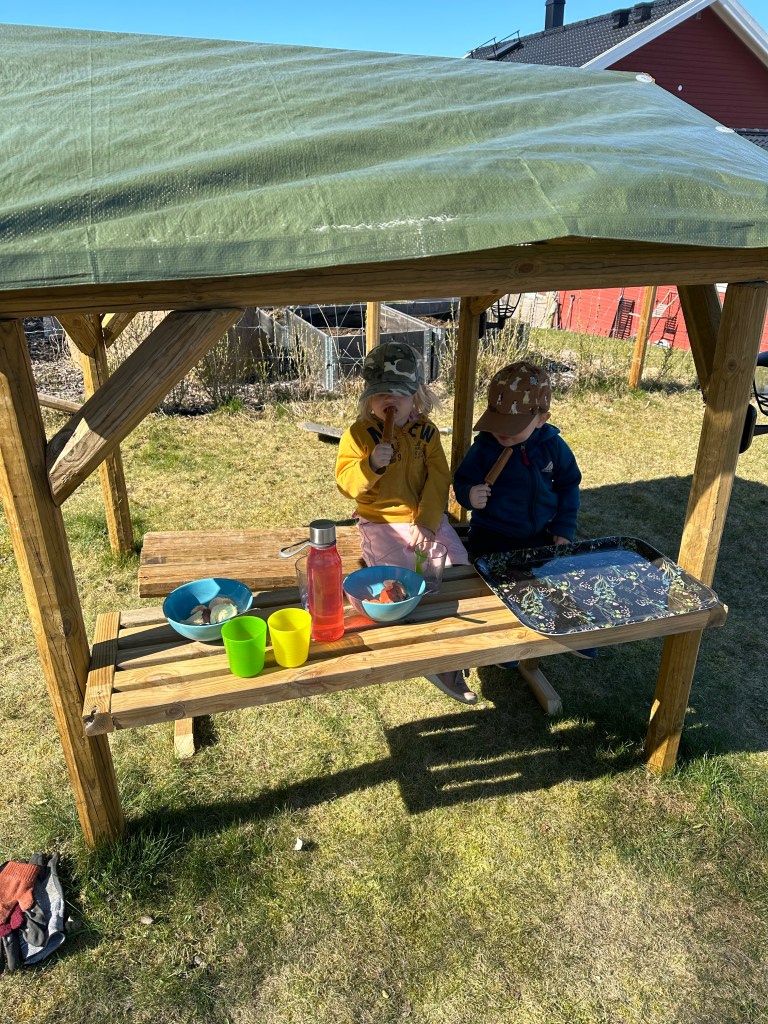 Igår byggdes det i kojan på tomten. Ett bord och en bänk byggdes och ett par solcellslampor kom upp. Detta invigdes med lite glass och saft i kojan. De nya tillskotten i kojan har varit väldigt uppskattade hos barnen som gärna hänger där uppe nu och leker.