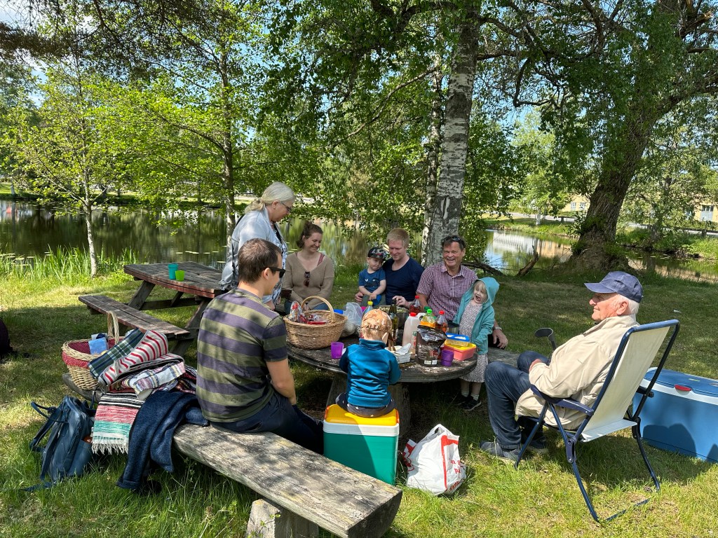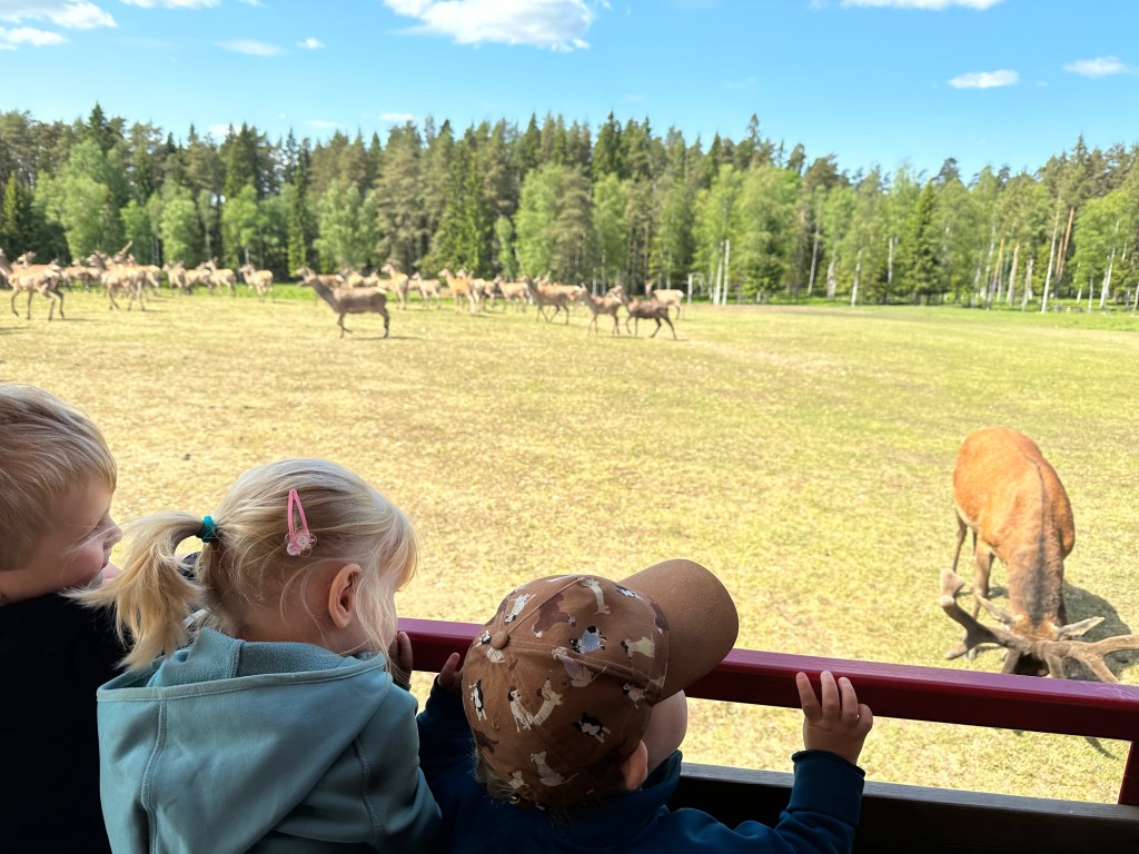 Vi möttes upp hemma hos mina föräldrar strax innan 11 och sedan bar det av österut. Det var bara mina föräldrar som visste målet så vi andra fick snällt följa med. Längs vägen stannade vi för picknick med medhavd pastasallad längs Svartån. Sedan åkte vi vidare och hamnade till slut vid Skullaryd Älgpark. Där fick vi åka på safari genom djurhängen och se på kronhjortar, älgar och dovhjortar. Riktigt uppskattat hos stora och små, även om barnen tyckte det var roligast att åka i vagnen bakom traktorn.