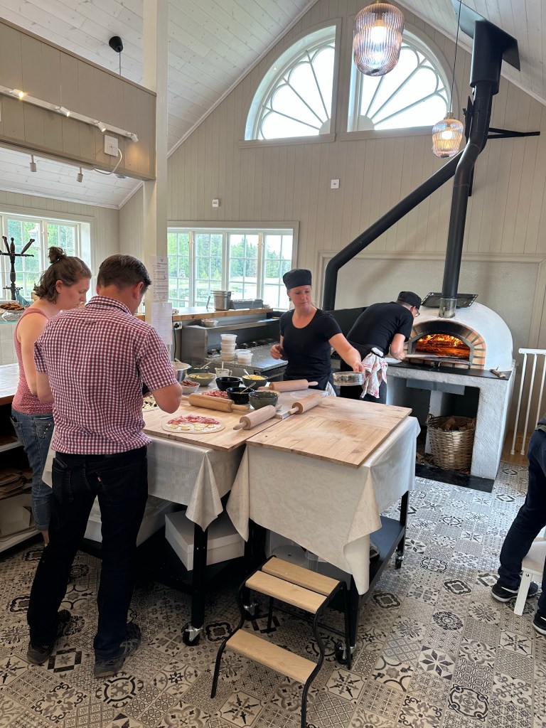 Efter en kort fika åkte vi vidare till nästa ställe nämligen Forssa kvarnagård. En familjegård där de maler sitt eget mjöl och bakar med det i sitt gårdsbageri. Vi började med en guidad tur inne i kvarnen för att sedan gå vidare till gårdscafét där vi fick göra egna vedugnsbakade pizzor, givetvis med mjöl från kvarnen. En massa bra tips på hur man ska baka pizza och förslag på toppningar fick vi också. Riktigt gott smakade det! Jag kunde inte bestämma mig vad jag ville göra för pizza så jag körde på olika på vardera halva. Ena bestod utav creme fracihe istället för tomatsås, hasselnötter, päron, ädelost och när den kom ut ur ugnen ringlades honung över. Andra halvan var tomatsås, grönkål, serranoskinka och hårdost.