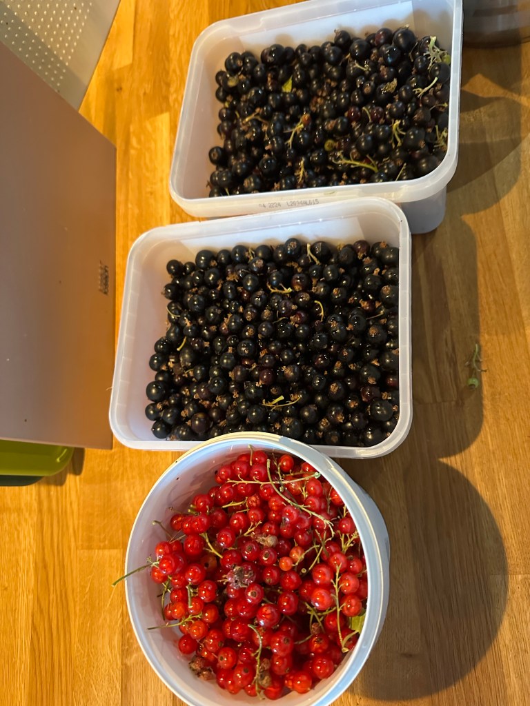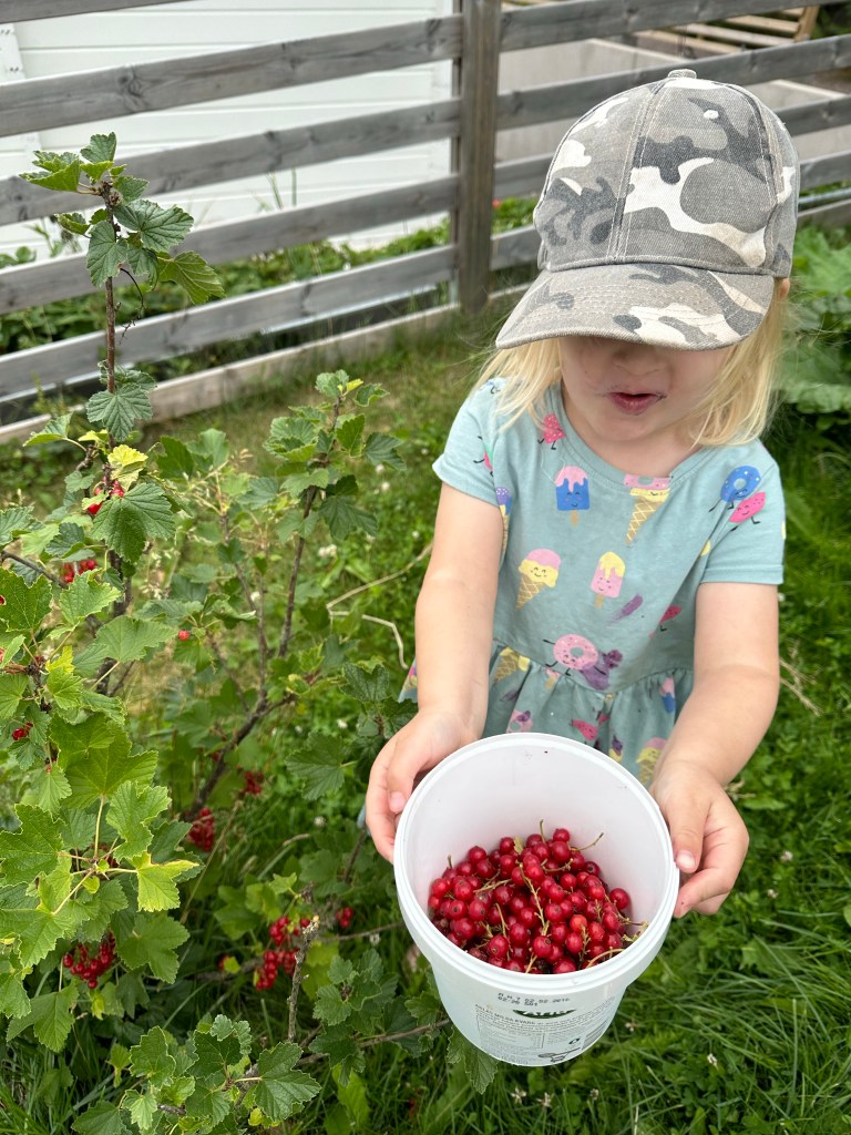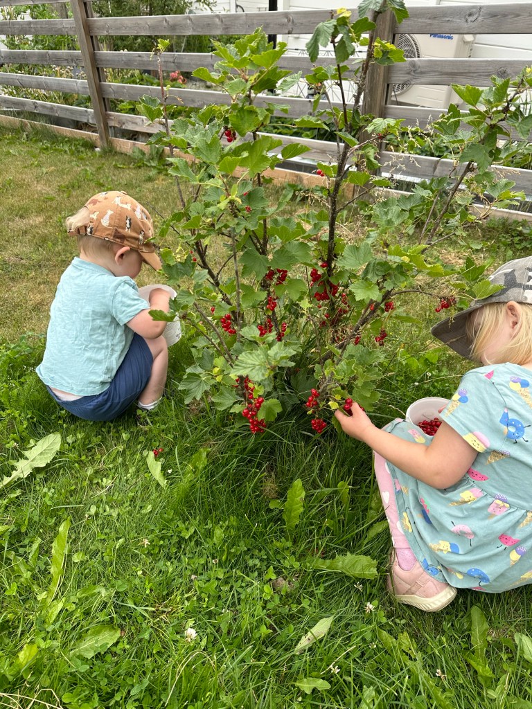 Vi började med en rejäl sovmorgon här hemma, följt av en mysfrukot med blåbärssmoothie. Efter det tog vi med oss varsin burk ut i trädgården och plockade vinbär. Barnen körde den röda busken medan jag och Joakim gav oss på de svarta.