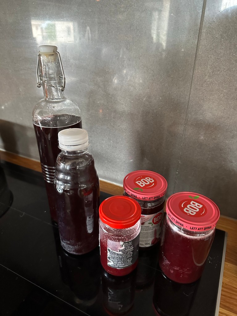 Det här är nog vårt bästa vinbärsår hittills och de svarta vinbären stormtrivs! 4 liter svarta och1 liter röda blev skörden för i år. Bären ska inte bara plockas utan även tas om hand, och barnen röstade fram saft och gelé. Så efter lunch på hemgjorda potatisbullar satte jag igång med saftandet. Otroligt smidigt med saftmaja. Saften blev en blandning av röda och svarta och gelén blev enbart på svarta.