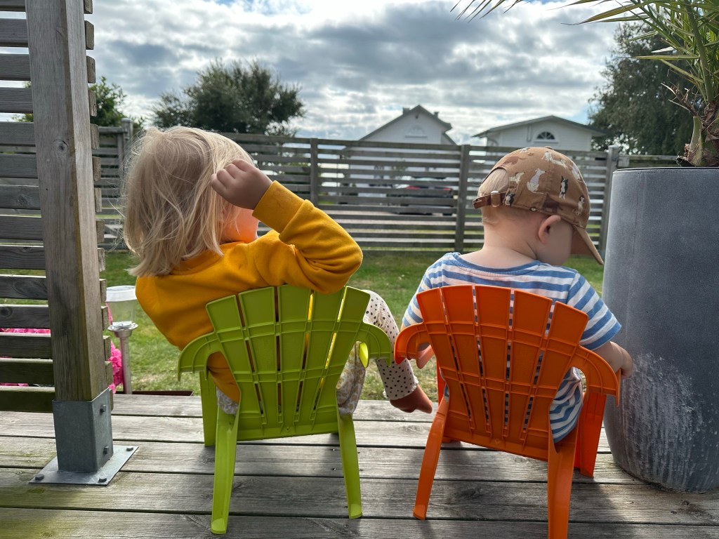 Tillbaka i stugan igen så det att ta det lite lugnt. Så lugnt som det går med två livliga barn, men de satt stilla och solade lite en liten stund iallafall, sedan var det av till lekparken igen. De har en stor uppblåst studsmatta där som är väldigt populär.