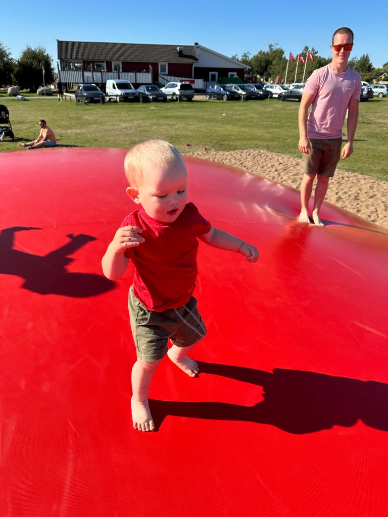 Tyvärr har inte vädret varit så pass varmt att det lockat att bada i havet men vi har haft att göra ändå. Dessutom kom de nya handdukarna som barnen fick av farmor och farfar till nytta ändå. Kan meddela att de var väldigt uppskattade hos barnen som gärna myste och sprang runt och lekte i dem. Den närliggande campingens lekpark hade en stor studsmatta som var väldigt populär, både hos stora och små. Och vilken träningsvärk man fick i magen efter att hoppat en stund på den, och det blev inte bättre av att jag varit ute och sprungit på morgonen.