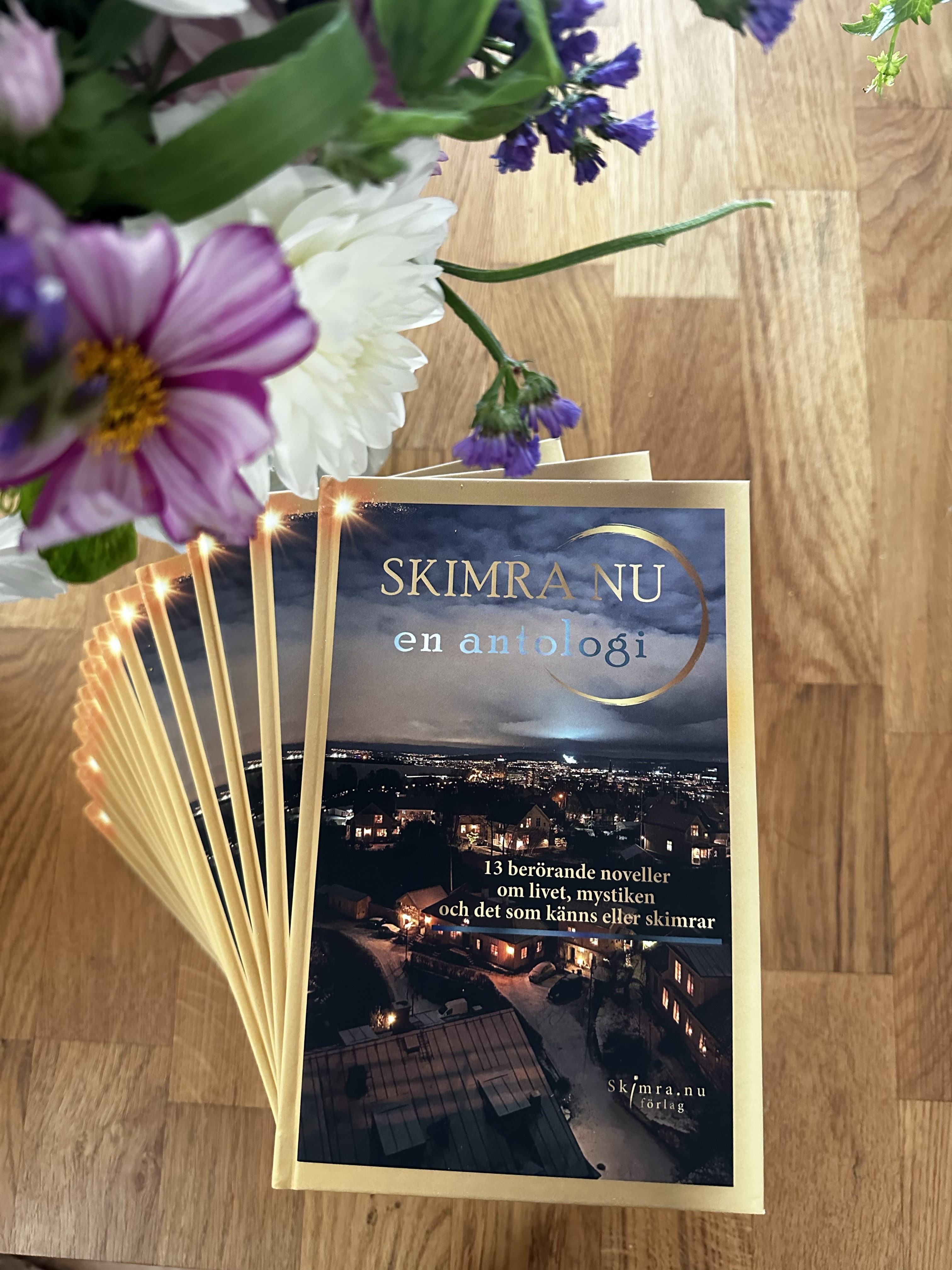 Idag efter jobbet fick jag åka och hämta ut ett paket, och vad låg däri om inte mina böcker! Jag har fått hem mina exemplar av novellsamlingen Skimra nu där jag medverkar med min novell ”Älskade perenn”.
