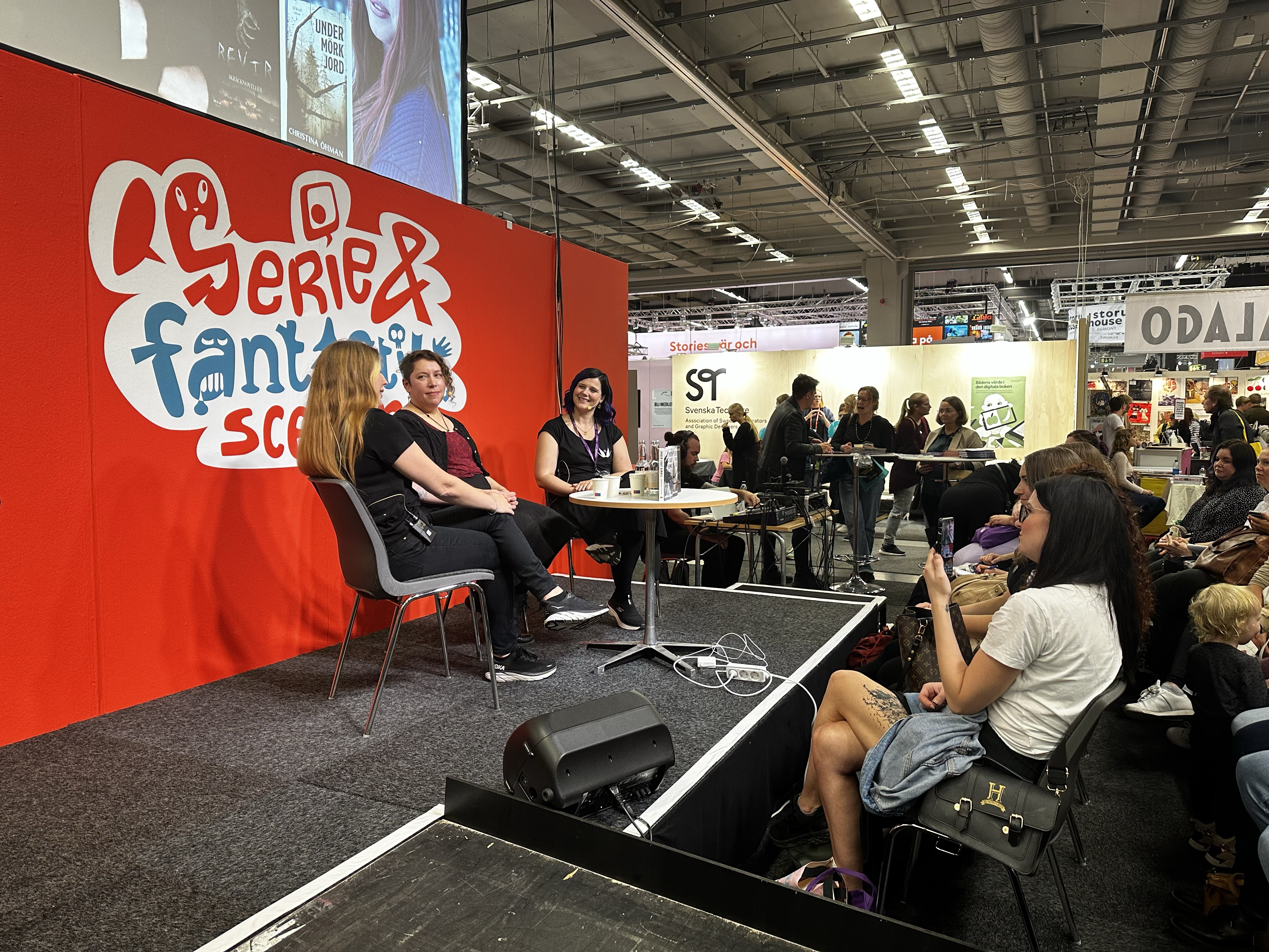 Det var otroligt mycket folk och vi lyssnade på olika föredrag. Väldigt ofta landade vi tillbaka vid Serafs monter (den lila montern). Ett härligt ställe att hänga på då många som man vill träffa kommer dit, montern är mysig och alla som är där är så trevliga. Jag kanske är något partisk eftersom det är med Seraf som min skräckroman kommer ut nästa år.