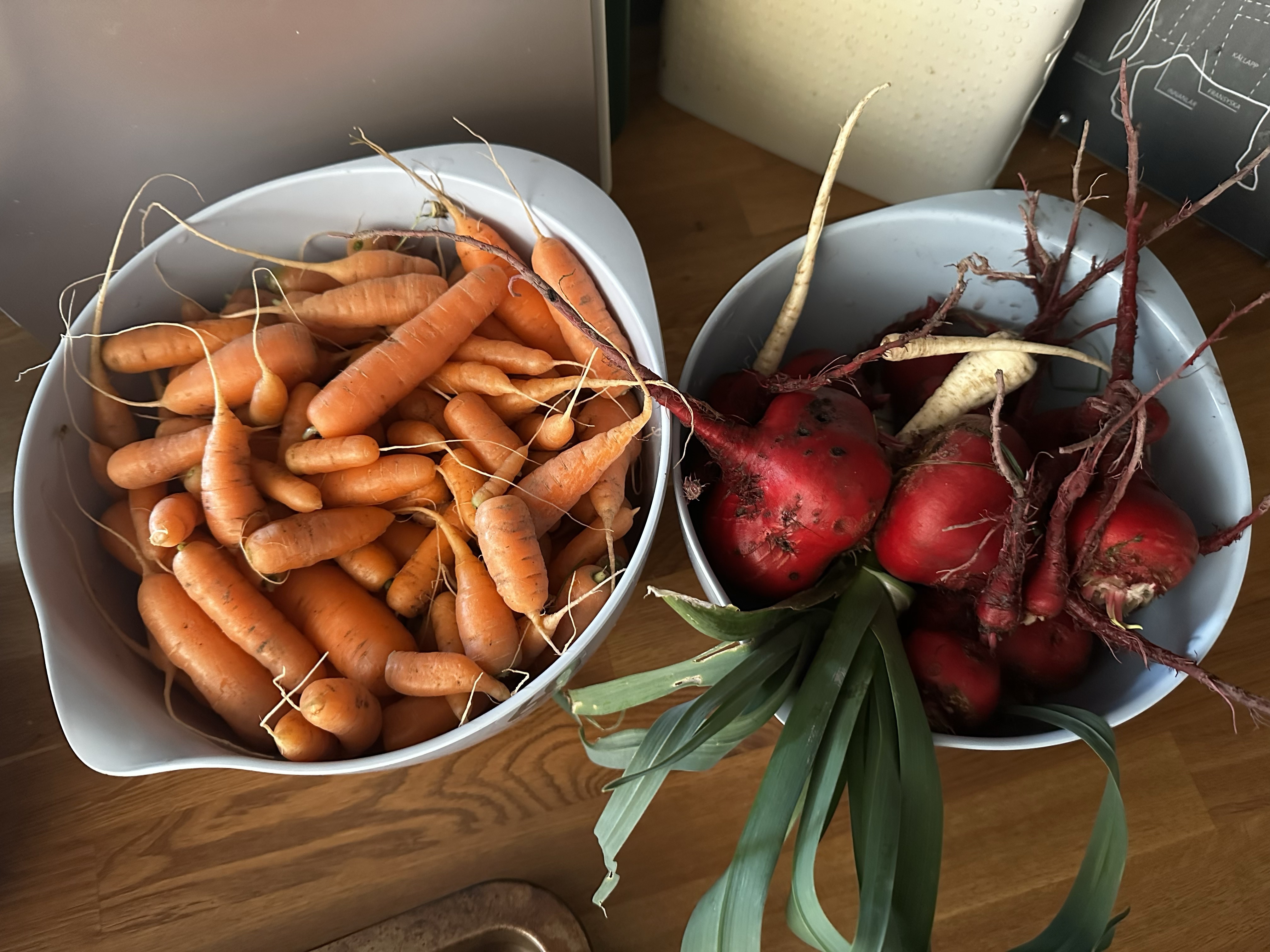 Fy sjutton vad råkallt det har varit idag! Vi var ute hela förmiddagen och fixade i trädgården inför hösten och vintern. Klippte gräset, plockade ner solseglet och skördade grönsaker. Det blev lite över 5 liter morötter och många härliga rödbetor också, och lite annat smått och gott som har fått komma in. Nu är det bara grönkålen som är kvar i landet. Och en del av grönsakerna gick åt till dagens lunch, vilken lyx det är med egenodlat och det smakar så gott!