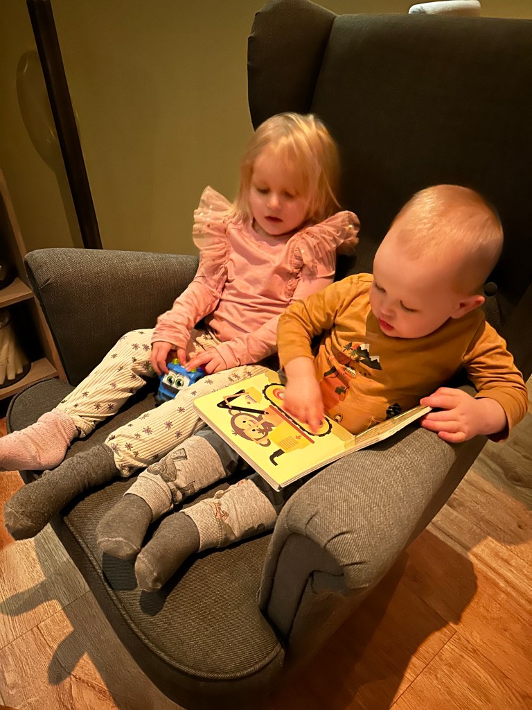 Min läsfåtölj är populär här hemma, och tycker det är så mysigt när man hittar barnen uppkrupna tillsammans och läser. Idag fick Wilhelm ta det extra lugnt här hemma då han ramlat och slagit i huvudet på förskolan så pass att det fanns lite oro för en eventuell hjärnskakning men han har mått bra hela eftermiddagen/kvällen så det känns bra!
